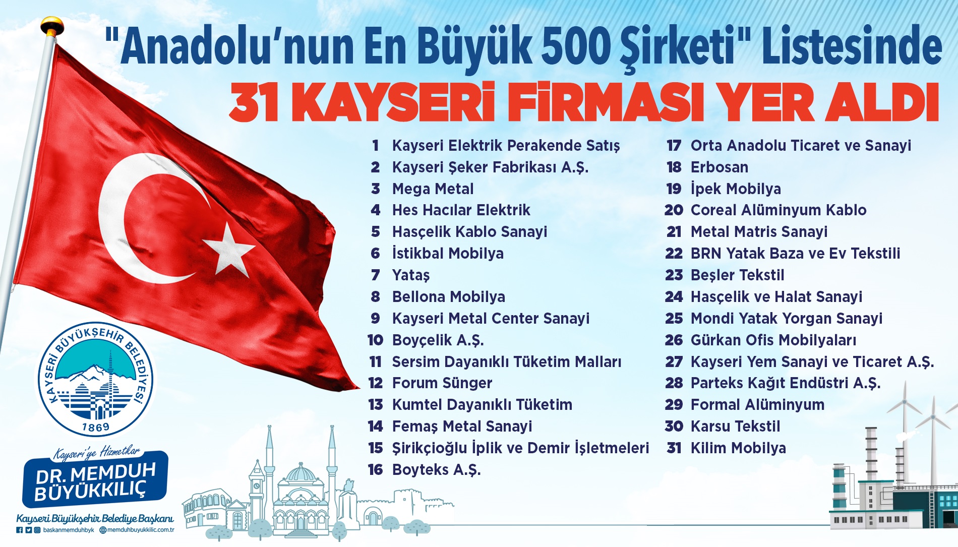 Şirketi Listesi”nde yer alan 31 Kayseri firmayı tebrik eden Başkan Büyükkılıç,