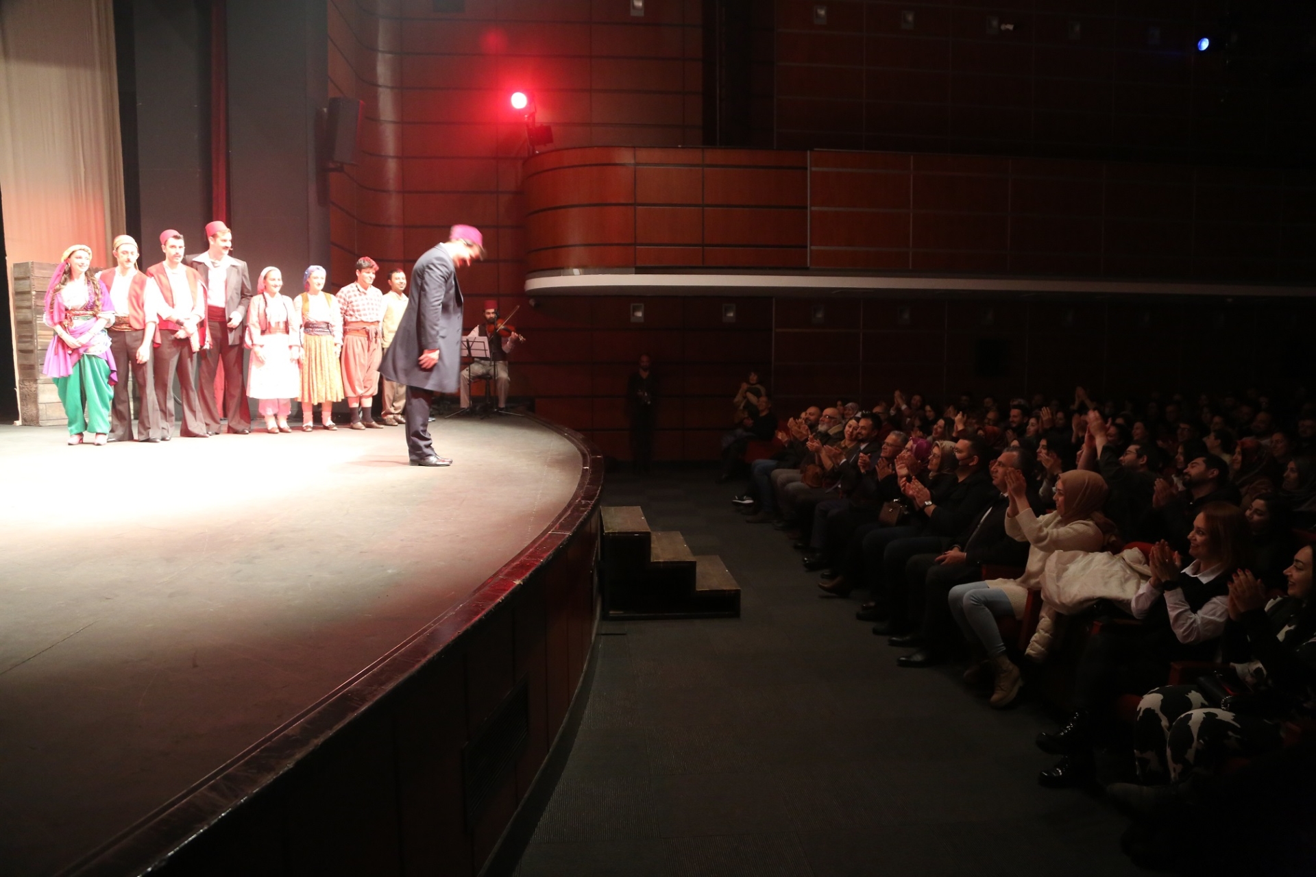 Kayseri Büyükşehir Belediye Başkanı Dr. Memduh Büyükkılıç, Erzurum Devlet Tiyatrosu sanatçılarının Kayseri Devlet Tiyatrosu’nda sahnelediği ‘Aşkımız Aksaray’ın En Büyük Yangını’ isimli tiyatro oyununu eşi Dr. Necmiye Büyükkılıç ile birlikte izledi. Oyunu ilgiyle izleyen Büyükkılıç, Erzurum Devlet Tiyatrosu sanatçılarına teşekkür ederken sanatseverleri de tiyatroya davet etti.