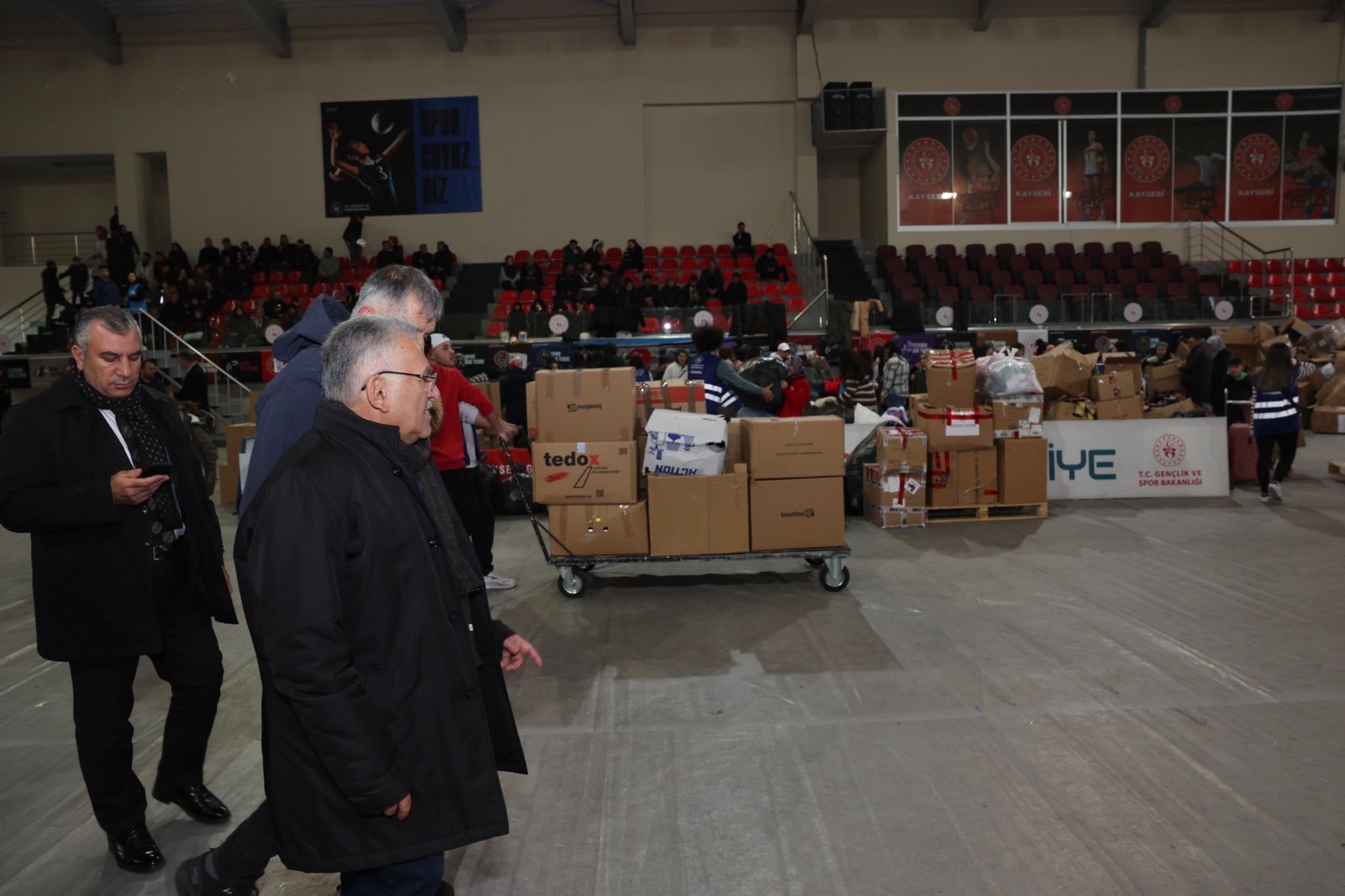 Depremzede vatandaşlar için gelen yardımların hazırlandığı, kentteki ve deprem bölgesindeki depremzede vatandaşlara ulaştırıldığı merkezde çalışmaları inceleyen Büyükkılıç, Gençlik ve Spor İl Müdürü Ali İhsan Kabakcı ve yetkililerden bilgi aldı.