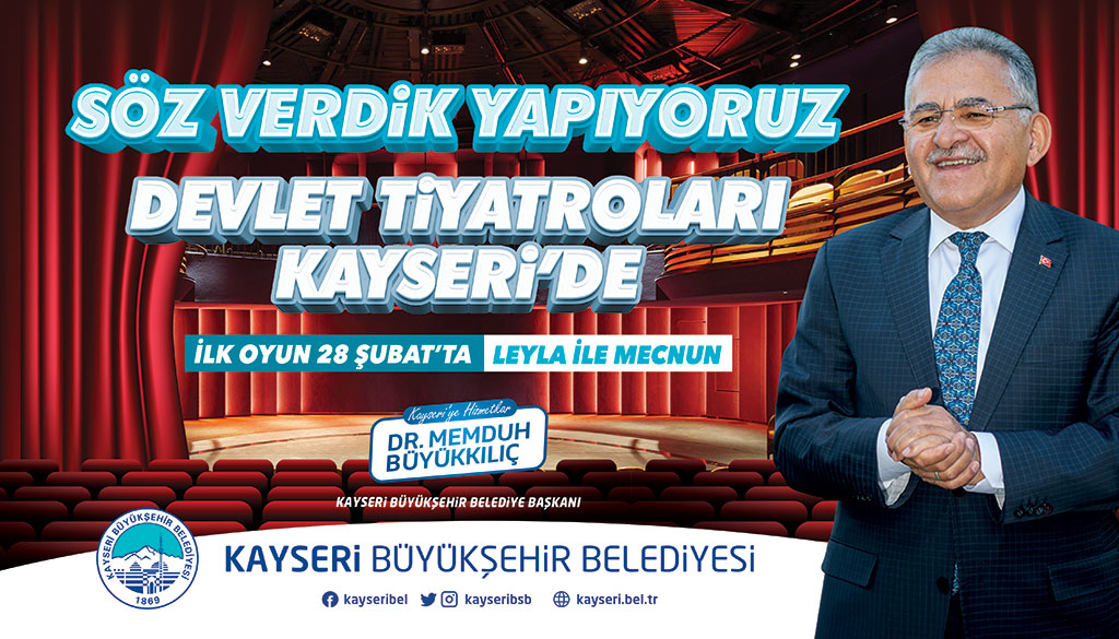Kayseri Büyükşehir Belediye Başkanı Dr. Memduh Büyükkılıç, Devlet Tiyatroları Genel Müdürlüğü’ne bağlı Kayseri Devlet Tiyatrosu’nun ilk oyununun 28 Şubat’ta sahneleneceğini açıkladı. Büyükşehir Belediye Başkanı Dr. Memduh Büyükkılıç, Kayseri’yi kültür ve sanatta da önemli bir şehir yapmak için çalışmalara hız kesmeden devam ettiklerini söyledi. Devlet Tiyatroları Genel Müdürlüğü’ne bağlı Kayseri Devlet Tiyatrosu’nun kurulması için Kültür ve Turizm Bakanlığı nezdinde yoğun gayret gösterdiklerini dile getiren Başkan Büyükkılıç, bu gayretlerin sonucu olarak Kayseri Devlet Tiyatrosu için çalışmaların başladığını belirtti. Kayseri Devlet Tiyatrosu’nun kurulması için Şehir Tiyatrosu’nu İl Kültür ve Turizm Müdürlüğü’ne devrettiklerini hatırlatan Başkan Büyükkılıç, “Tiyatrosuyu daha modern hale getirmek için kısmi tadilat çalışmalarını sürdürüyoruz. ‘Kayseri aynı zamanda tiyatro şehri de olacak’ dedik ve sözümüzde durduk. Girişimlerimiz sonucu ilk oyun 28 Şubat’ta sahnelenecek” dedi. Devlet Tiyatroları, İskender Pala’nın yazdığı Leyla ile Mecnun adlı oyunu 28 Şubat’ta Kayseri Devlet Tiyatrosu’nda sahneye koyacak. Oyun, 29 Şubat ve 1 Mart tarihlerinde de Kayserili tiyatroseverlerle buluşacak.