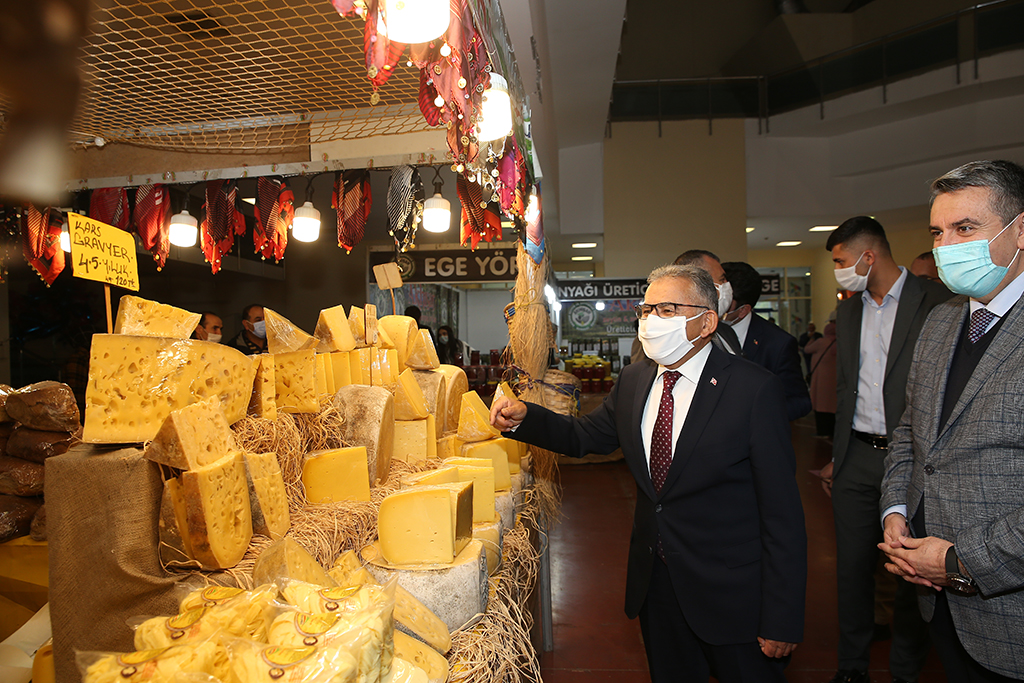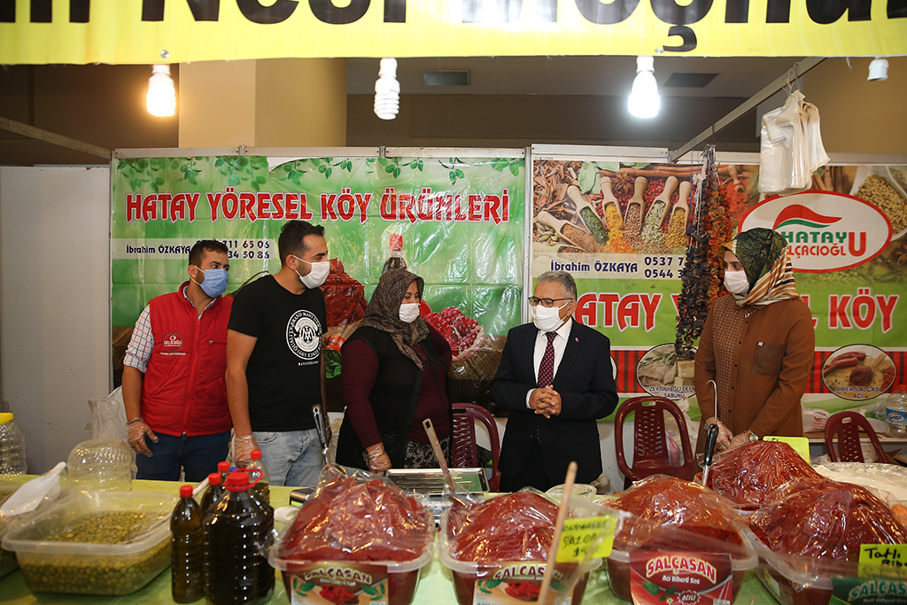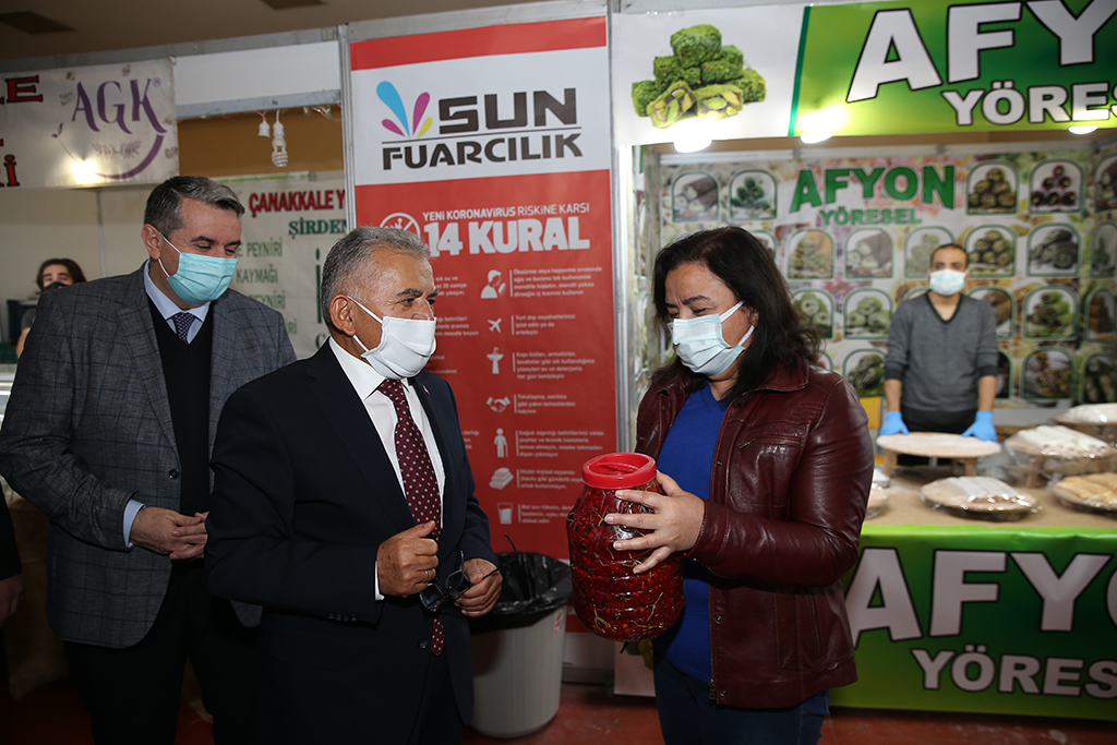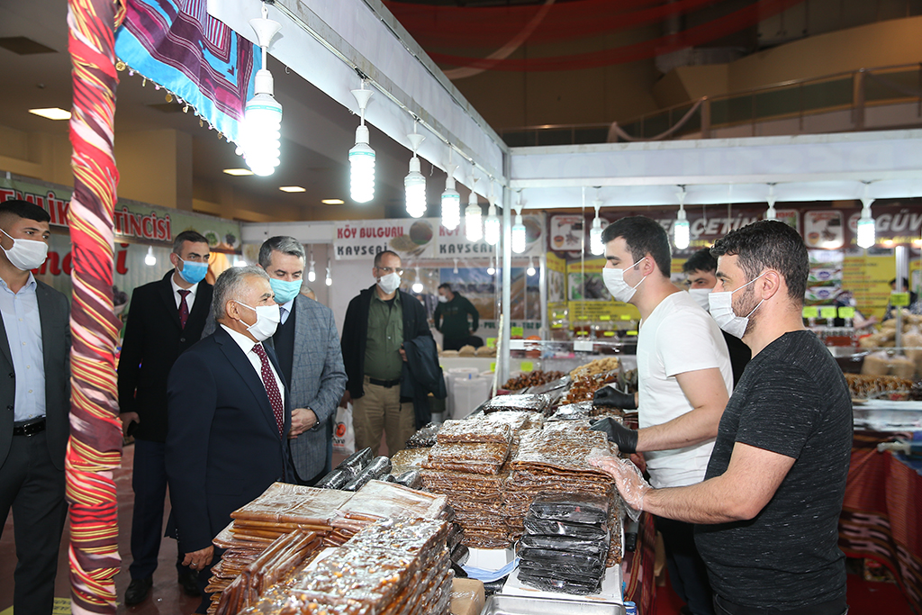 Kayseri Büyükşehir Belediye Başkanı Dr. Memduh Büyükkılıç, Yöresel Ürünler Fuarı’nı ziyaret edip, 40 şehirden değişik ürünlerin sergilendiği standları gezerek, vatandaşlarla sohbet etti. Başkan Büyükkılıç, yöresel zenginliklerin buluştuğu fuarla ilgili “Vatandaşlarımız kurallara uymak koşulu ile bu güzel hizmetten yararlansınlar” dedi. Büyükşehir Belediye Başkanı Dr. Memduh Büyükkılıç, Cuma namazını Ahmet ve Ayşe İnci Camii’nde kıldıktan sonra yeni tip korona virüs tedbirleri kapsamında Dünya Ticaret Merkezi Fuar Alanı’na kurulan Yöresel Ürünler Fuarı’nı ziyaret etti. Fuar girişinde ateş ölçer ile ateşini ölçtüren Büyükkılıç, 40 ilden 100 firmanın katıldığı, o bölgelerin meşhur ürünlerinin olduğu stantları gezerek, esnaf ve vatandaşlarla sohbet etti. Kendisine ikram edilen yöresel lezzetlerin tadına bakan Başkan Büyükkılıç, birçok ilden Kayseri’ye gelen ve ürünlerinin hem tanıtımını hem de satışını yapan esnafa işlerinde kolaylıklar ve helal kazançlar diledi. Başkan Büyükkılıç, Hacılar Belediyesi Üretim Tesisleri’nde üretilen manda yoğurdu, kaymak ve peynir, Akkışla Belediyesi’nin gilaboru ve turşu, Kocasinan Belediyesi’nin Cırgalan biberi, kedi bacağı, salça, Yamula Patlıcanı, Gömeç fasülyesi gibi ürünlerin olduğu stantları da gezerek, Kayseri’nin zenginliklerine dikkati çekti. Başkan Dr. Memduh Büyükkılıç Kocasinan Belediyesi’nin standı önünde yaptığı açıklamada, şöyle konuştu: “Sizin memleketin neyi meşhur adı altında ülkemizin değişik, şehir ve bölgelerinden gelen ürünler vatandaşlarımızın hizmetine sunulmaktadır. Pandemi sürecine uygun hareket edilmekte. Maske, mesafe ve temizlik kurallarına uyulduğu gibi, girişte vatandaşlarımızın ateşi ölçülüp, dezenfektan ile temizlik yapılıyor. Kocasinan Belediyemiz önce fideleri dağıttı, sonra domatesleri toplayıp, organik salça yaptı. Kahramanmaraş ile yarışacak değiliz ama Cırgalan biberi asla göz ardı edilemez, yeri apayrı güzel. Gömeç’in fasulyesi tadına doyum olmaz. Gelelim en önemlisine; Yamulanın patlıcanı, görünümü başka, tadı bambaşka. Burada yok yok diyoruz. Vatandaşlarımız kurallara uymak koşulu ile bu güzel hizmetten yararlansınlar. Kayserimize gelmiş dostlarımıza hoş geldiniz diyor, Kayserimizden katılan esnaflarımız ile hepsine hayırlı işler diliyorum.” Kendisine özel hazırlanan Hatay künefesinin şerbetini dökerek vatandaşlara ikram etmeyi ihmal etmeyen Başkan Büyükkılıç, çocuklar başta olmak üzere vatandaşlar ile bol bol sohbet edip, hatıra fotoğrafı çektirdi.