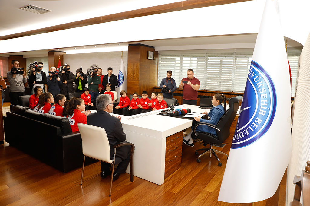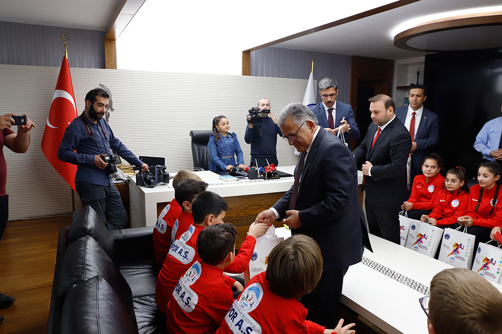 Büyükşehir Belediye Başkanı Dr. Memduh Büyükkılıç, öğleden önce 23 Nisan Ulusal Egemenlik ve Çocuk Bayramı nedeniyle gerçekleştirilen resmi kutlamalara katıldı, ardından da makamının 4. Sınıf öğrencisi Sudenur Gündüz’e devretti. Başkanlık makamına oturan Sudenur Gündüz’ün talimatları anında yerine getirildi. Büyükşehir Belediye Başkanlık koltuğuna Av. Ahmet Ulucan İlkokulu 4. Sınıf öğrencisi Sudenur Gündüz oturdu. Koltuğunu Sudenur Gündüz’e devreden Büyükşehir Belediye Başkanı Dr. Memduh Büyükkılıç, tüm milletimizin 23 Nisan Ulusal Egemenlik ve Çocuk Bayramını tebrik ederek huzur içinde daha nice bayramlara erişmemiz temennisinde bulundu. Başkan Büyükkılıç, 23 Nisan’ı tüm çocukların bir şenlik havasında kutlamaları için Büyükşehir Belediyesi tarafından düzenlenen etkinliklerle ilgili de bilgi verdi. Büyükşehir Belediye Başkanlığını devralan Sudenur Gündüz de, üç yıldır Spor A.Ş.’de lisanslı olarak basketbol oynadığını hatırlatarak spor ve sporcuya verdiği destekler nedeniyle Başkan Büyükkılıç’a teşekkür etti. 23 Nisan’ı bir bayram olarak armağan eden başta Gazi Mustafa Kemal Atatürk ve silah arkadaşlarına teşekkür eden Başkan Gündüz, “Bizlere emanet edilen vatanımız ve bayrağımız uğruna hiç düşünmeden 100 yıl önce olduğu gibi canımızı vermeye hazırız. Sevgi ve dostluğun tüm dünyayı kucakladığı neşe ve mutluluk dolu daha nice bayramlara ulaşmayı diliyorum” dedi. Başkan Sudenur Gündüz daha sonra Büyükşehir Belediyesi’ne ait müzeler ile buz pateni pistinin 23 Nisan’da ücretsiz olması talimatını verdi. Başkan Büyükkılıç da talimatın hemen yerine getirildiğini ifade ederek, “Valiliğimize vekalet eden çocuğumuzun talimatı ile Hayvanat Bahçesi 1 hafta ücretsiz olmuştu. Buz pateni pisti ve müzelerin yanı sıra Erciyes’teki mekanik tesisler de bugünlük çocuklarımıza ücretsiz. Bugün sizin gününüz. Bayramı gerçek manada kutlamanız için Büyükşehir Belediyesi her türlü imkanı sunuyor” diye konuştu. Başkan Büyükkılıç daha sonra makamında ağırladığı çocuklara çeşitli hediyeler verdi.
