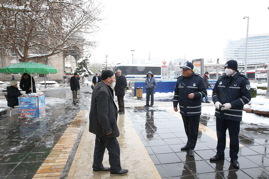 Kayseri Büyükşehir Belediyesi Zabıta Ekipleri, koronavirüs salgınının azaltılması ve toplum sağlığının korunması için bilgilendirme çalışmaları da yapıyor. Zabıta ekipleri tarafından Cumhuriyet Meydanı ve çevresi başta olmak üzere esnafa yönelik bilgilendirme çalışmaları başlatıldı. Zabıta ekipleri ayrıca, özellikle yaşlılarımıza hastalıktan korunmaları için evlerine gitme çağrısı yapıyor ve hatta talep edenleri bizzat evlerine bırakıyor. Kayseri Büyükşehir Belediyesi Zabıtası, koronavirüs salgınının önlenmesi için yaptığı çalışmalara bir yenisini daha ekledi. Esnafı gezen zabıta ekipleri hem esnafın hem de müşterilerin sağlığının korunması için maske ve eldiven konusunda bilgilendirme yaptı. Esnaflara maske takan ve eldiven dağıtan zabıta ekipleri virüsün yayılmasının engellenmesi için daha fazla duyarlılık gösterilmesi çağrısında bulundu. ULU ÇINARLAR EVLERİNDE KALSIN Büyükşehir Belediyesi zabıta ekipleri Cumhurbaşkanımızın da sık sık vurguladığı yaşlılarımızın bu süreçte evlerinde kalmaları için de bilgilendirmede bulunuyorlar. Ulu Çınarlarımıza evlerinde kalmaları tavsiyesinde bulunan zabıta ekipleri, talep edilmesi halinde yaşlılarımızı ya da engellilerimizi evlerine de bırakıyorlar.