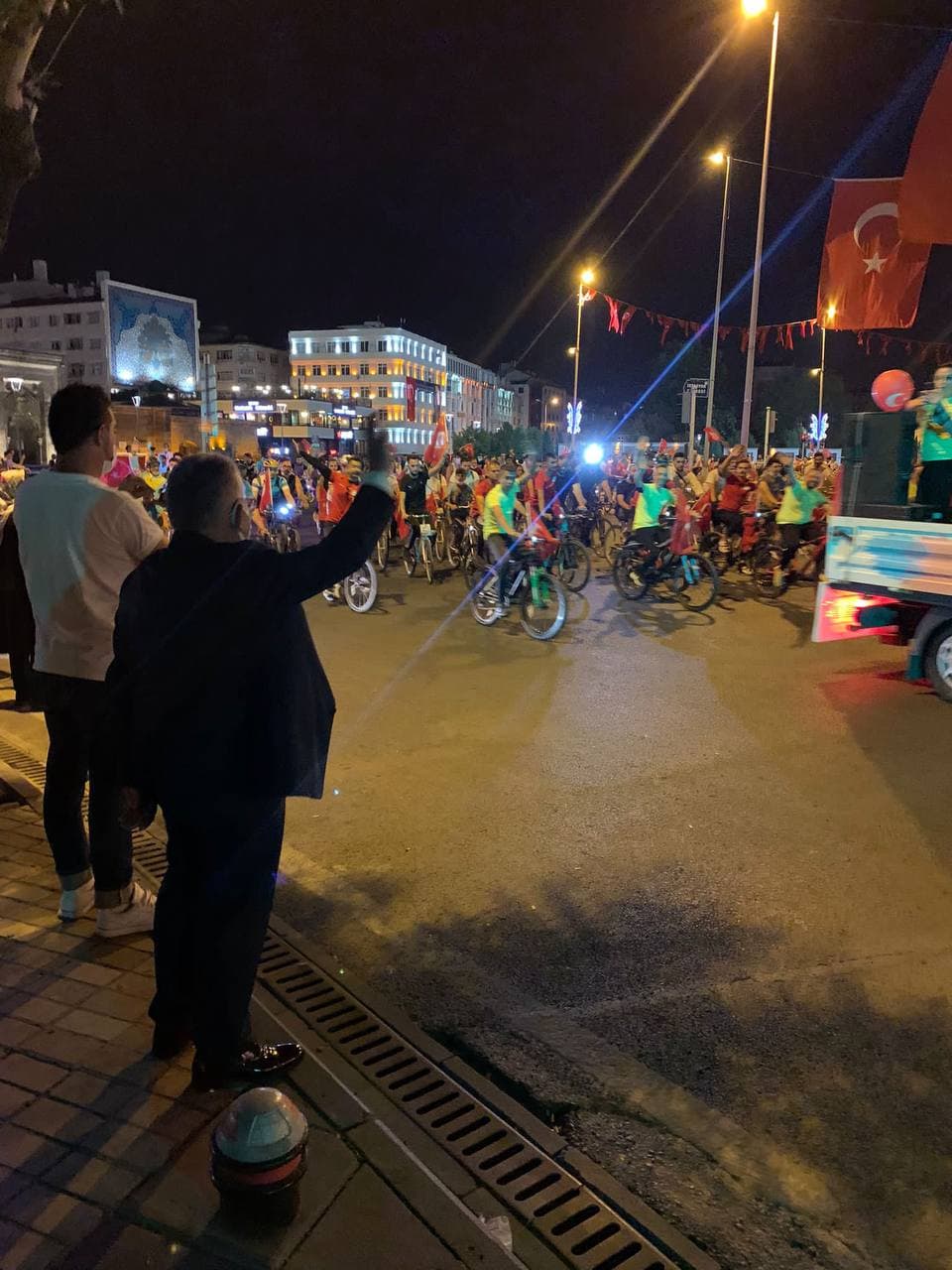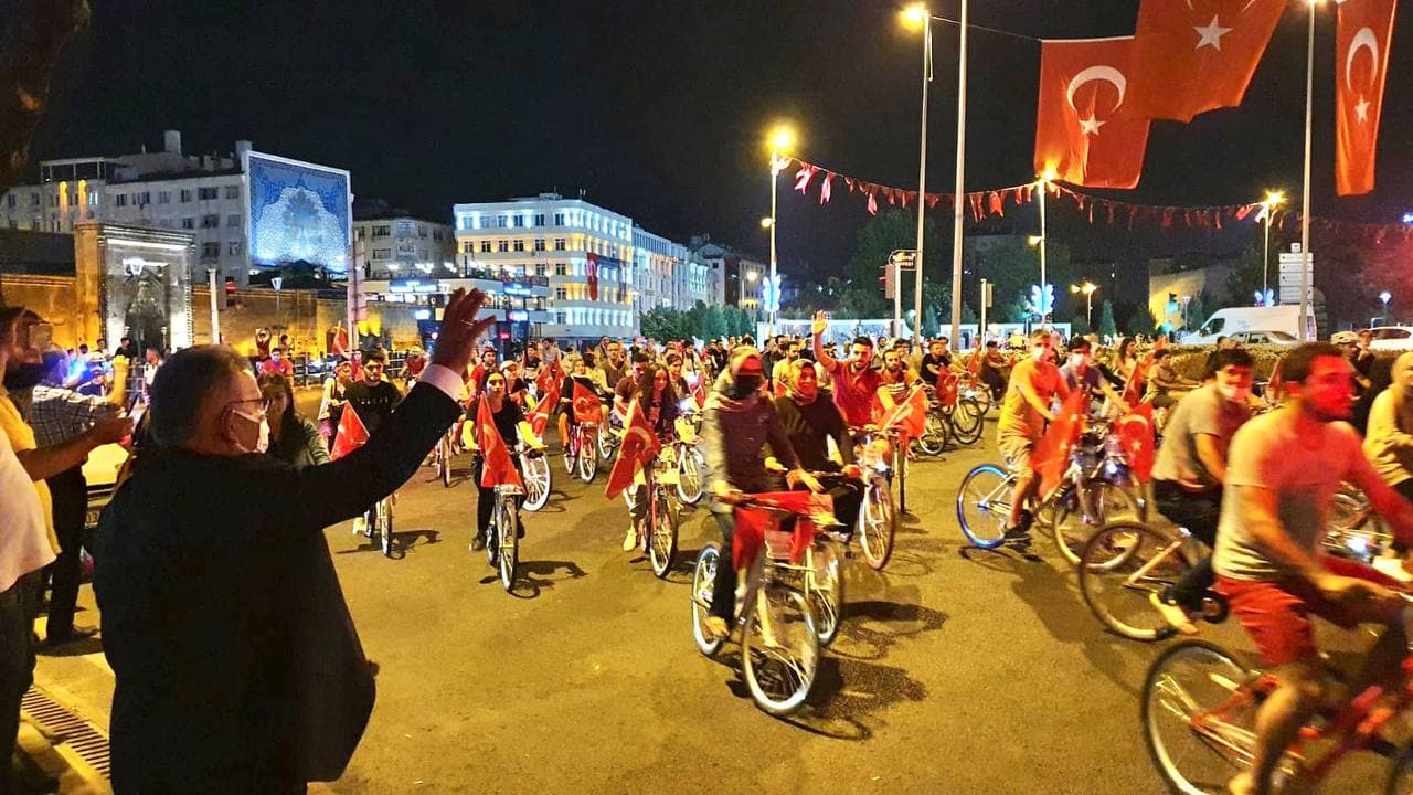 Cumhuriyet Meydanı’nda pedalseverleri selamladı.