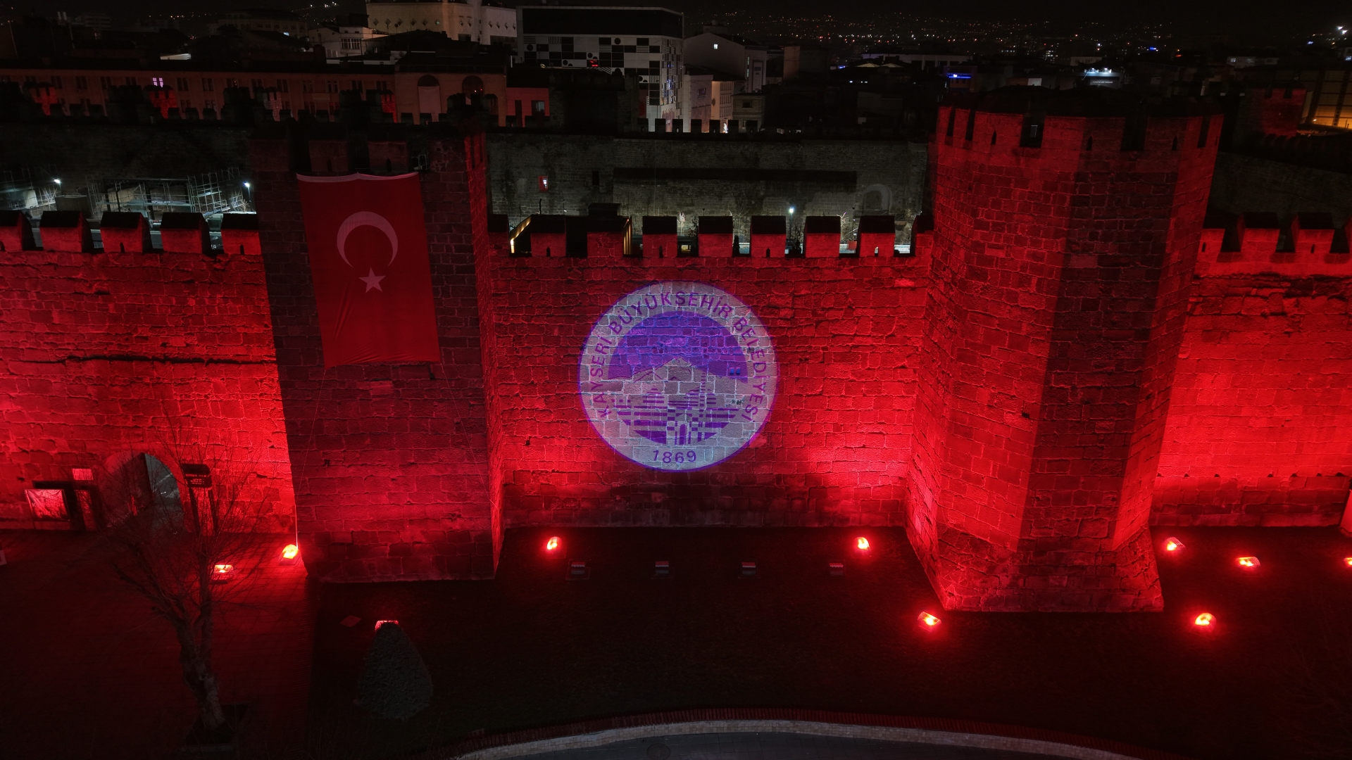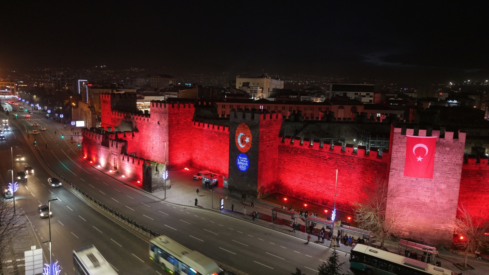 Kale surlarına yansıtılan ışıklandırma beraberinde Türk bayrağı ile birlikte ‘hoş geldin 11 ayın sultanı Ramazan’ yazısını da yansıtan Büyükşehir, huzur ayı Ramazan’ı ışıklar ve renklerle karşılıyor.