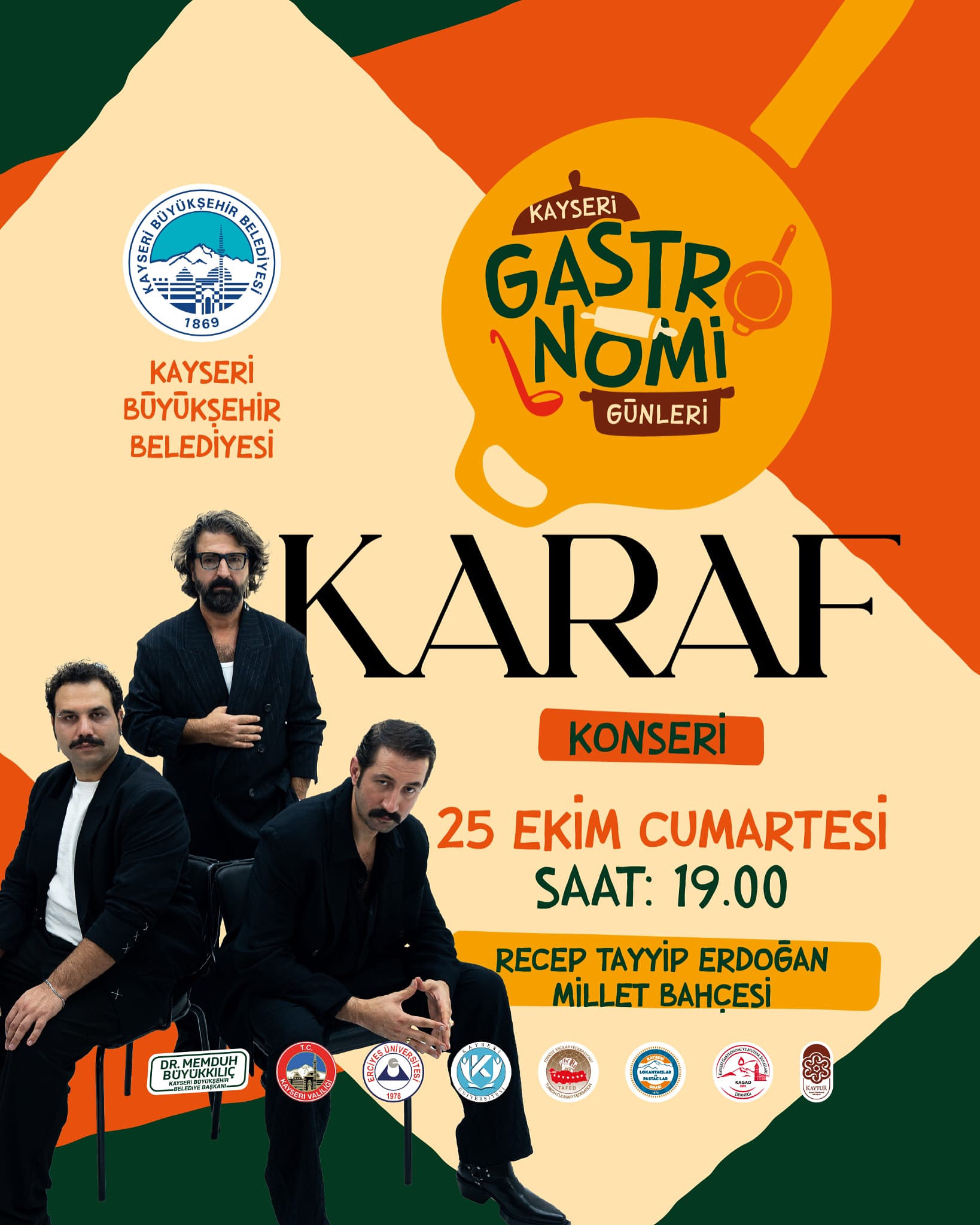 Kayseri Gastronomi Günleri sadece mutfakla sınırlı kalmayacak. 25 Ekim Cumartesi günü saat 19.00’da sevilen grup Karaf, 24-26 Ekim tarihlerinde ise Turan Güneş konseri ile katılımcılara müzik ziyafeti sunacak. Çocukların da unutulmadığı festival tadındaki etkinlikte 25 Ekim Cumartesi Kukuli konseri, 26 Ekim Pazar günü Sevimli Dostlar programı minikler için sahne alacak.