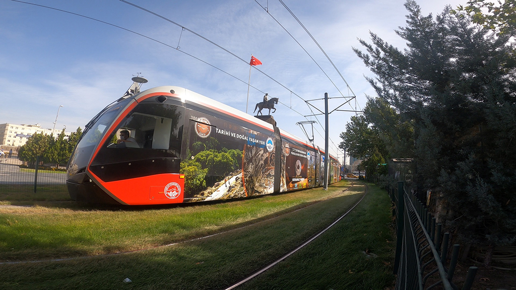 Kayseri’de gün içerisinde binlerce kilometre yol yapan tramvaylar, bu seyahatleri sırasında adeta tarihe yolculuk yaparcasına şehrin tarihi değerlerini tanıtıyor. UNESCO Dünya Mirası Geçici Listesi’ne giren Koramaz Vadisi ile Kültepe Kaniş- Karum’un görselleriyle donatılan tramvayla tarihi ve kültürel mirasın tanıtımına katkı sağlıyor. Kayseri’deki tarihi, kültürel ve coğrafi değerlerin tanıtılmasına önem veren Büyükşehir Belediye Başkanı Dr. Memduh Büyükkılıç’ın talimatıyla tramvayla kente ait tarihi ve kültürel değerlerle donatılıyor. İlk etapta UNESCO Dünya Mirası Geçici Listesi’ne giren Koramaz Vadisi ve Kültepe Kaniş- Karum’un fotoğrafları ile donatılan tramvaylar, gün içerisinde kat ettikleri güzergah boyunca vatandaşları tarihi bir yolculuğa da çıkarıyor. Medeniyetlerin beşiği konumundaki Kayseri’de, kente ait değerlerin bu şekilde tanıtılması vatandaşlar tarafından da memnuniyetle karşılandı. Önümüzdeki dönemlerde Kayseri ile özdeşleşmiş değerlerin de toplu ulaşım araçlarında yer alacağı belirtildi.
