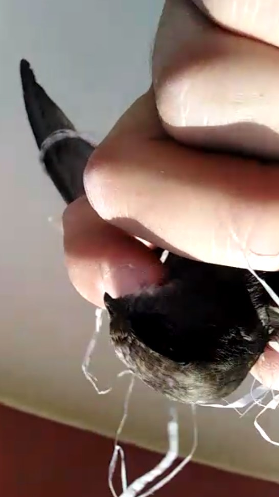 ilçesinde 10 katlı binanın çatısında iplere dolanan kırlangıcı kurtarıp,