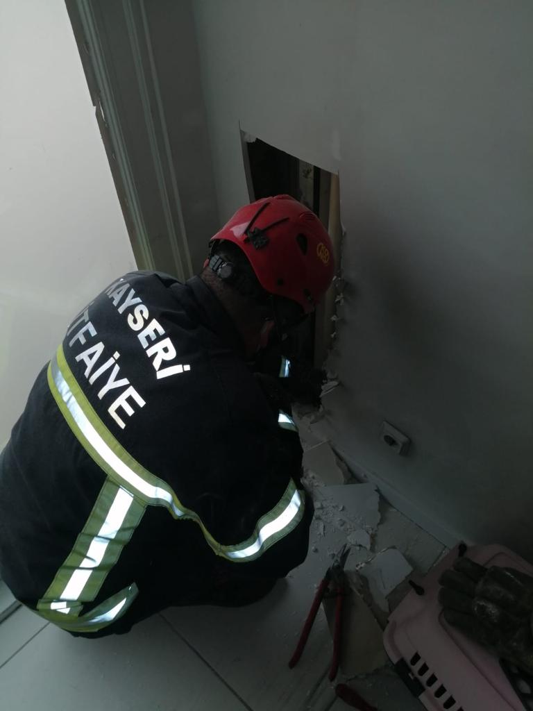 DUVAR BOŞLUĞUNDA MAHSUR KALAN KEDİ KURTARILDI