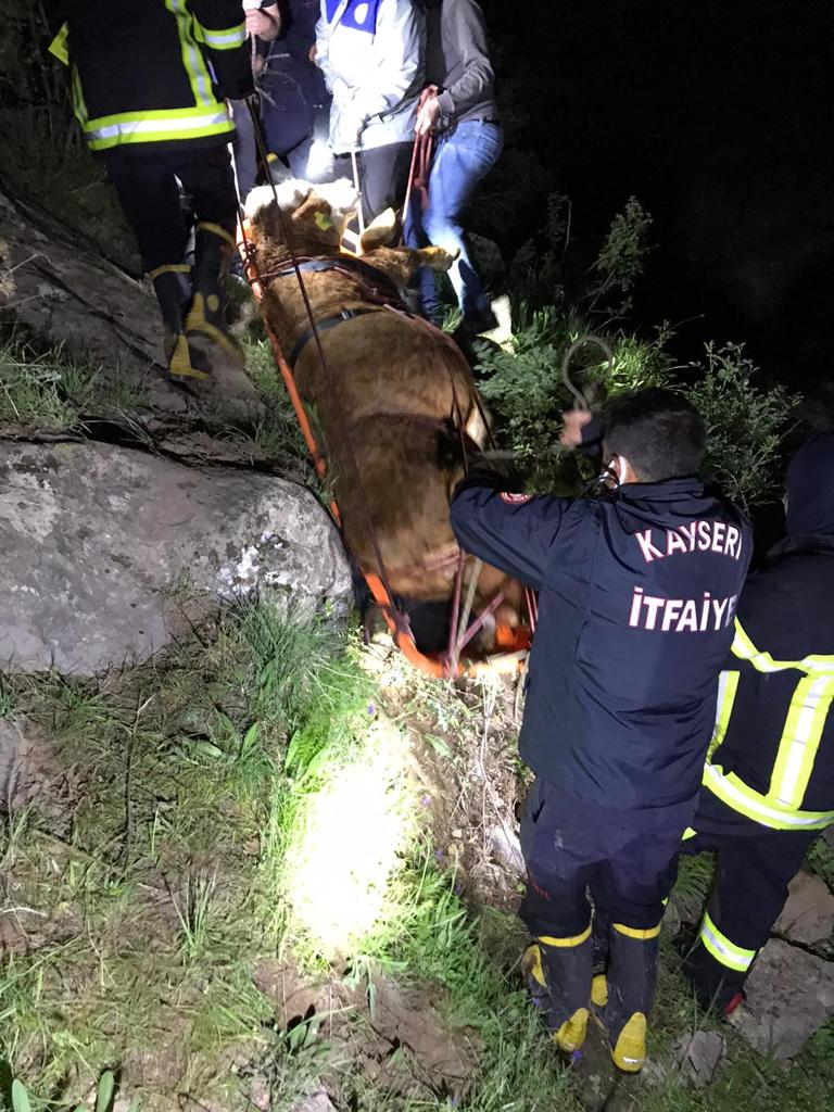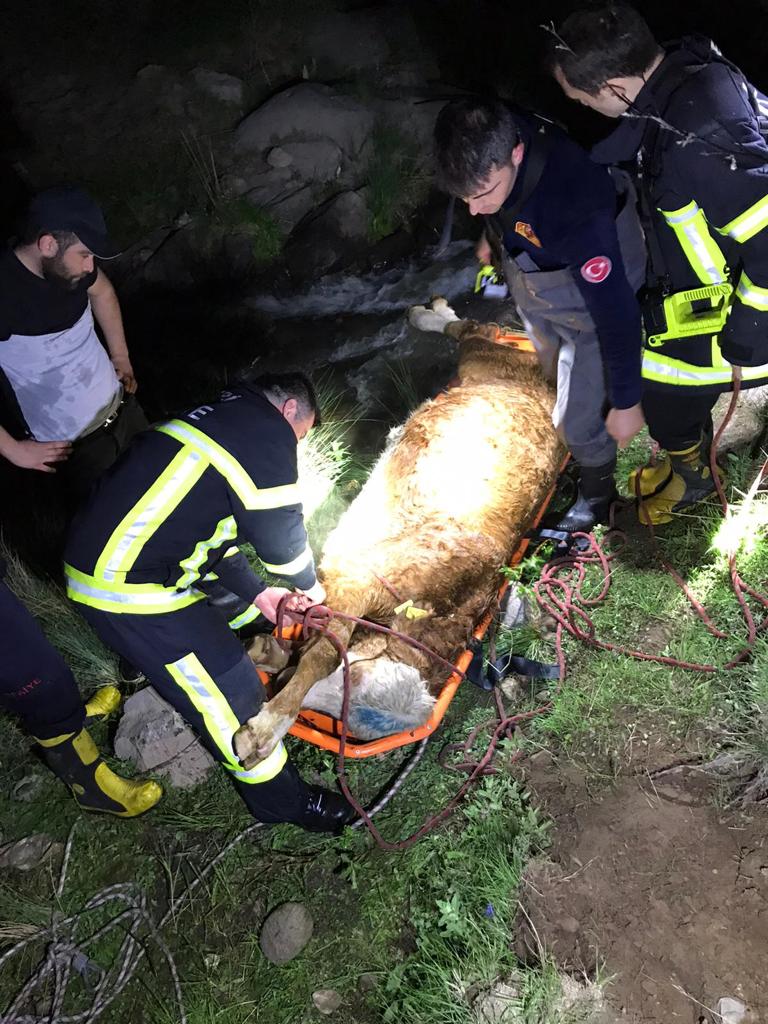 kalan bir büyükbaş hayvanı 8 saat süren operasyon ile kurtardı. Ekiplerin,