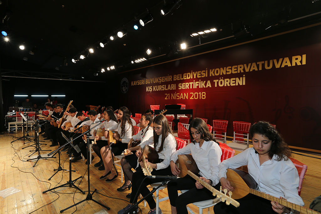 Kayseri Büyükşehir Belediyesi Konservatuarı kış dönemi kursları, öğrencilere sertifikalarının verilmesiyle sona erdi. Yaklaşık 2 bin öğrenci kış dönemi kurslarından mezun oldu. Öğrenciler, Kadir Has Kültür ve Sanat Merkezi’nde çeşitli gösteriler yaptılar. Her yıl yaklaşık beş bin kişinin 21 ayrı branşta ders alarak bir sanat dalında ilerlemesini sağlayan Büyükşehir Belediyesi Konservatuvarı, kış kurslarından yaklaşık 2 bin öğrenciyi mezun etti. 9-15 yaş grubundaki öğrencilerin sertifika töreni Kadir Has Kültür ve Sanat Merkezi’nde yapıldı. Mezun olan öğrencilerin aileleriyle birlikte katıldığı sertifika töreninde Kadir Has Kültür ve Sanat Merkezi tamamıyla doldu. Öğrenciler, mezuniyet etkinliğinde kış dönemi kurslarında öğrendiklerini sahneye taşıma imkanı da buldu. Kış döneminde 9 ayrı branşta kurslar gören öğrenciler gruplar halinde sahneye çıkarak çeşitli gösteriler yaptılar.