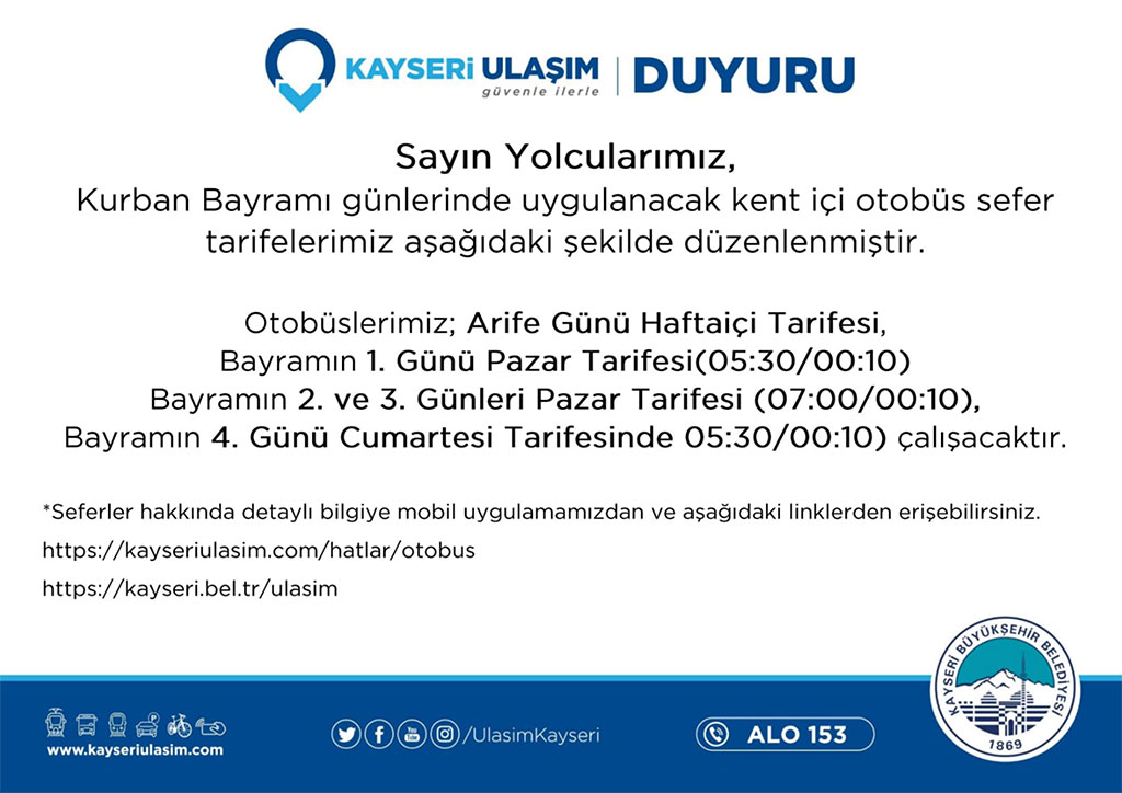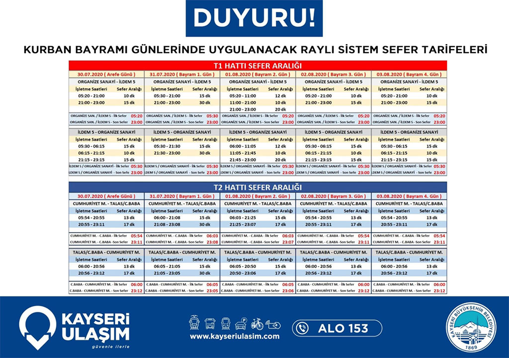 Büyükşehir Belediyesi yaklaşan Kurban Bayramı dolayısıyla vatandaşların bayramlarını huzur içerisinde geçirebilmeleri ve herhangi bir sıkıntıyla karşılaşmamaları için bir takım tedbirler aldı. Kurban Bayramı’nda Büyükşehir Belediyesi Kayserililerin hiçbir sorun ve sıkıntı yaşamamaları adına birçok çalışmalar yapıyor. Buna göre Büyükşehir Belediyesi zabıta ekipleri tarafından Kurban Bayramı süresince açık alanlarda et çekimi ve sucuk yapımına izin verilmeyecek. Ekipler arife gününden itibaren Covid-19 Salgını için Maske, Mesafe ve Temizlik kurallarını denetleyecek ve vatandaşlara uyarılarda bulunacak. Kurban Bayramı boyunca ekipler vatandaşların hijyenik ve huzurlu bir şekilde kurban ibadetini gerçekleştirebilmeleri için 7/24 denetimlerine devam edecek. Vatandaşlar zabıtayı ilgilendiren konularla ilgili şikayetlerini Büyükşehir Belediyesi’nin Alo 153 İletişim Merkezi ve Merkez Zabıta Amirliğinin 232 29 60 nolu telefonuna iletebilecekler. Diğer yandan KASKİ Genel Müdürlüğü, Kayseri ve Civarı T.A.Ş. Genel Müdürlüğü ile Kayserigaz arıza ekipleri de vatandaşların su, elektrik ve doğalgaz şikayetlerini gidermek için 24 saat kesintisiz mesai yapacak. Su ile ilgili şikayetler için vatandaşlar KASKİ Genel Müdürlüğü’nün 185, elektrik arızaları için Kayseri ve Civarı T.A.Ş. Genel Müdürlüğü’nün 186 ile doğalgaz arızaları için Kayserigaz’ın 187 nolu telefonlarını arayabilecekler. KESİM YERLERİNDE VETERİNER HEKİM Öte yandan Büyükşehir Belediyesi, Kurban Bayramı süresince kurban kesim yerlerinde veteriner hekim bulunduracak. Veteriner hekimler, isteyen vatandaşların kurbanlık hayvanlarını, ücretsiz olarak kontrol edecek. Büyükşehir Belediyesi tarafından Kayseri’de toplamda 25 adet kurban satış yeri, 41’i şehir merkezinde olmak üzere toplamda 79 adet kurban kesim noktası belirlendi. Belirlenen bu noktalarda merkezde 51 veteriner hekim görevlendirildi. Her kesim yerinde vatandaşların iletişime rahat geçebilmesi için görevlendirilen veteriner hekimin bilgilerinin olduğu pankartlar yerleştirilecek. Aynı zamanda belirlenen her kurban kesim noktası da kurbanlar vatandaşlara verilen randevularla belirlenen zaman aralığında gerçekleştirilecek olup herhangi bir yoğunluğa mahal verilmemesi içinde çalışmalar yapılacak. Kurban Bayramı süresince ilgili birimler tarafından denetimler devam edecek. OTOBÜS SEFERLERİ KURBAN BAYRAMINA GÖRE DÜZENLENDİ Bayram tatili süresince vatandaşların şehir içi ulaşımlarını hızlı ve rahat bir şekilde sağlamak üzere otobüs seferlerinde de düzenlemeler yapıldı. Büyükşehir Belediyesi vatandaşların şehir içi ulaşımlarını rahat bir şekilde sağlamaları için otobüs ve raylı sistem seferlerini aksatmadan sürdürecek. Yapılan düzenlemeye göre otobüsler bayramın ilk üç günü pazar günleri sürdürülen tarifeye, dördüncü günü ise cumartesi günü yapılan tarifeye göre çalışacak. Raylı sistem seferleri ise bayram tatili süresince farklılık gösterecek. Seferler İldem için 05.20’ de, Talas için 05.54 olarak başlayacak.