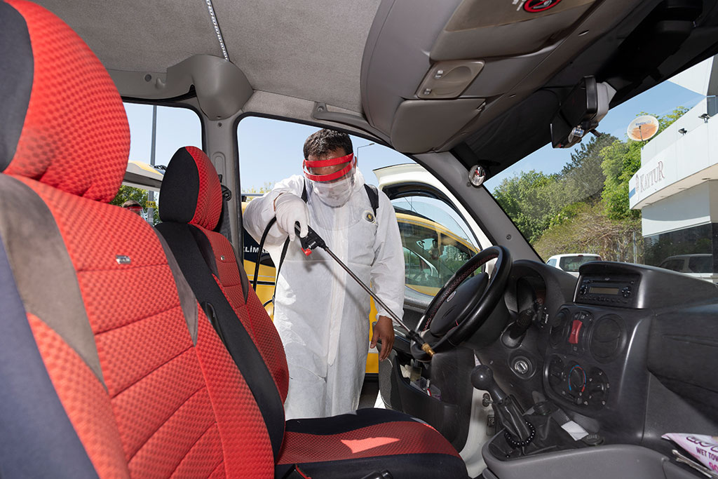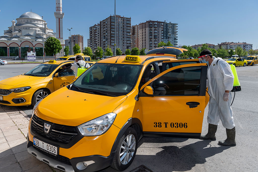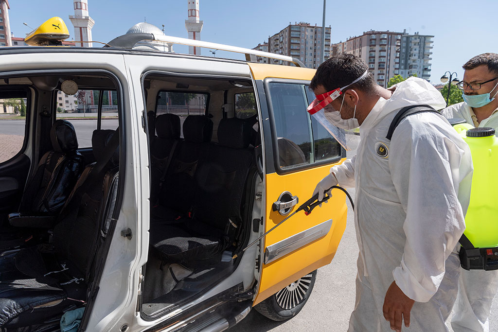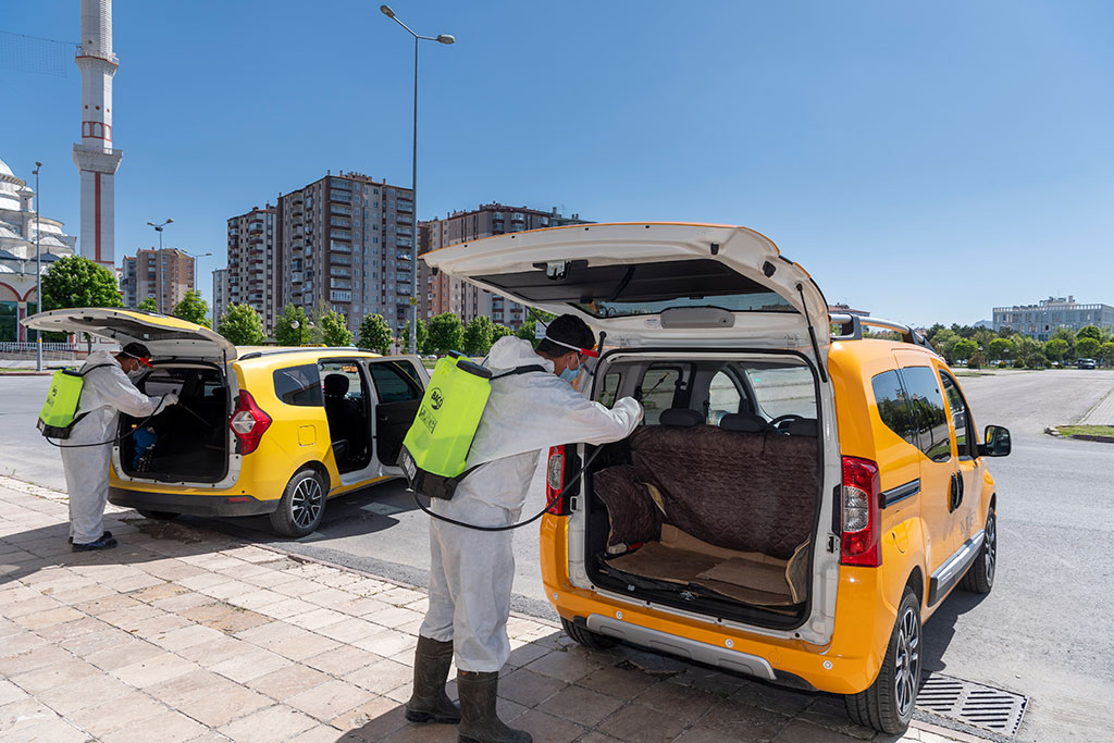 Kayseri Büyükşehir Belediyesi, sağlıklı bir ulaşım için toplu ulaşım araçlarının yanı sıra ticari taksileri de dezenfekte ediyor. Kayseri’de bulunan yaklaşık 800 taksinin dezenfekte işlemi Büyükşehir Belediyesi ekipleri tarafından yapılıyor. Kayseri Büyükşehir Belediyesi, koronavirüs tehdidinin bertaraf edilmesi için hemen her sahadaki çalışmalarına hız kesmeden devam ediyor. Koronavirüs ile mücadele sürecindeki en önemli ihtiyaçlar olan maske ve dezenfektanı kendi bünyesinde üreterek sorun yaşanmasının önüne geçen Büyükşehir Belediyesi, ürettiği dezenfektanları toplum sağlığını gerektiren yerlerde kullanıyor. Ulaşımın daha sağlıklı sürdürülmesi için de yoğun bir çalışma yapan Büyükşehir Belediyesi, bu kapsamda yeni bir çalışma daha başlatıldı. Kayseri’de faaliyet gösteren ticari taksilerin tamamının dezenfekte işlemini Büyükşehir Belediyesi gerçekleştiriyor. Kayseri Dünya Ticaret Merkezi önünde yapılan çalışmalardan Kayseri’deki yaklaşık 800 ticari taksi faydalanıyor.
