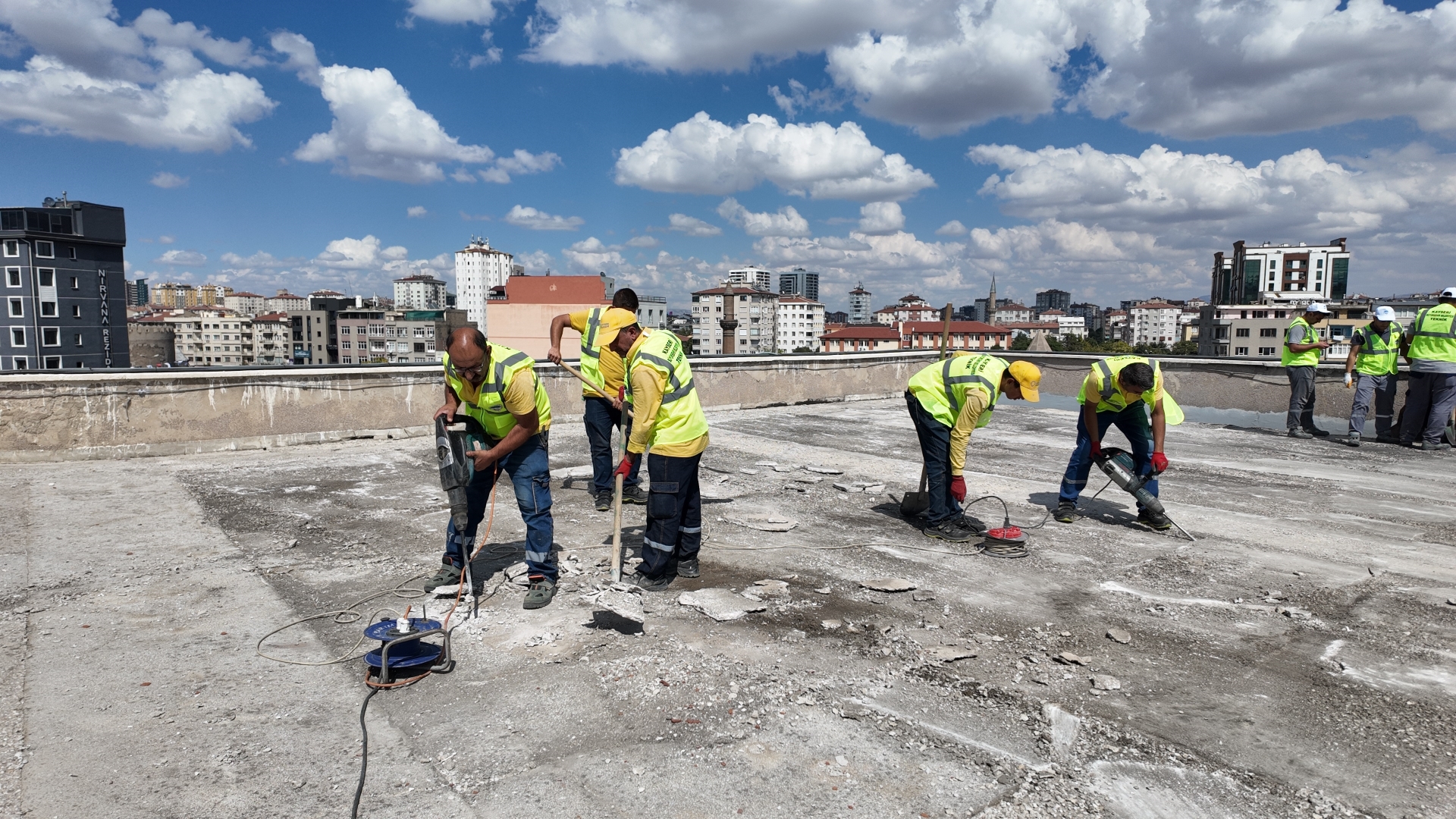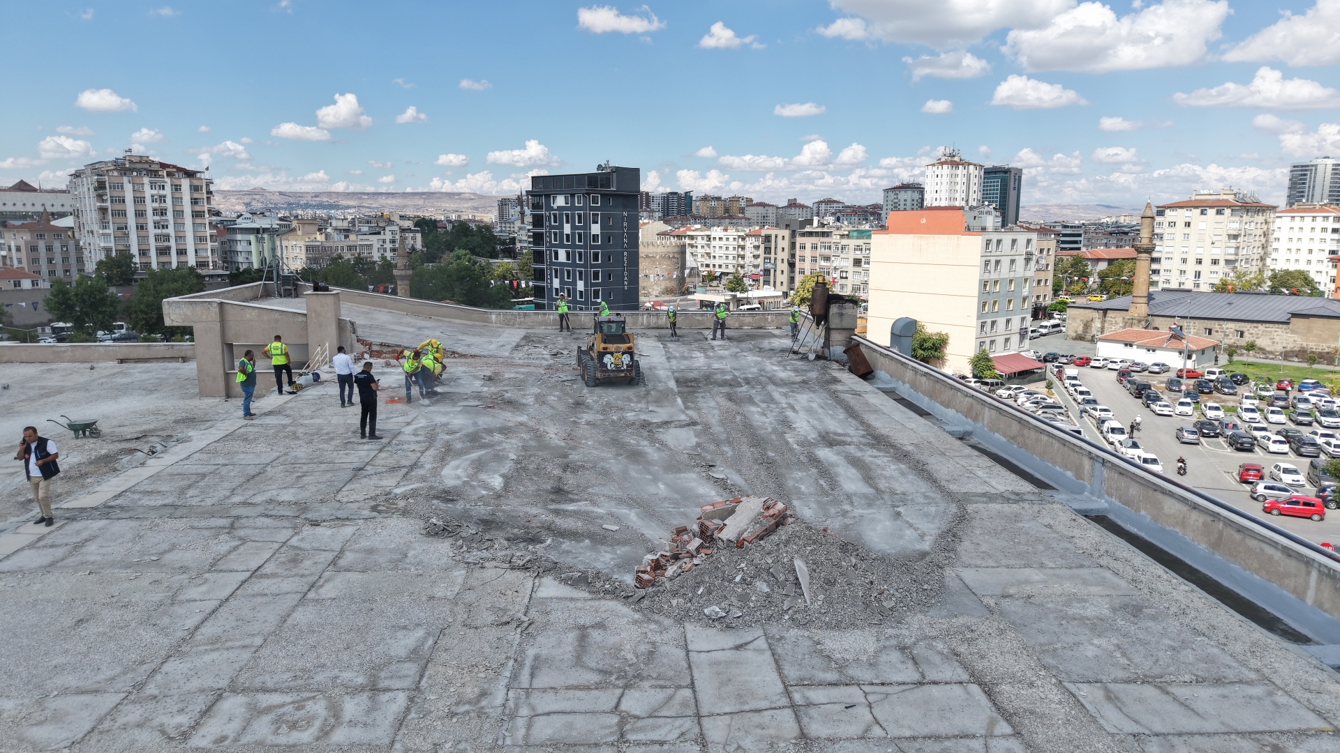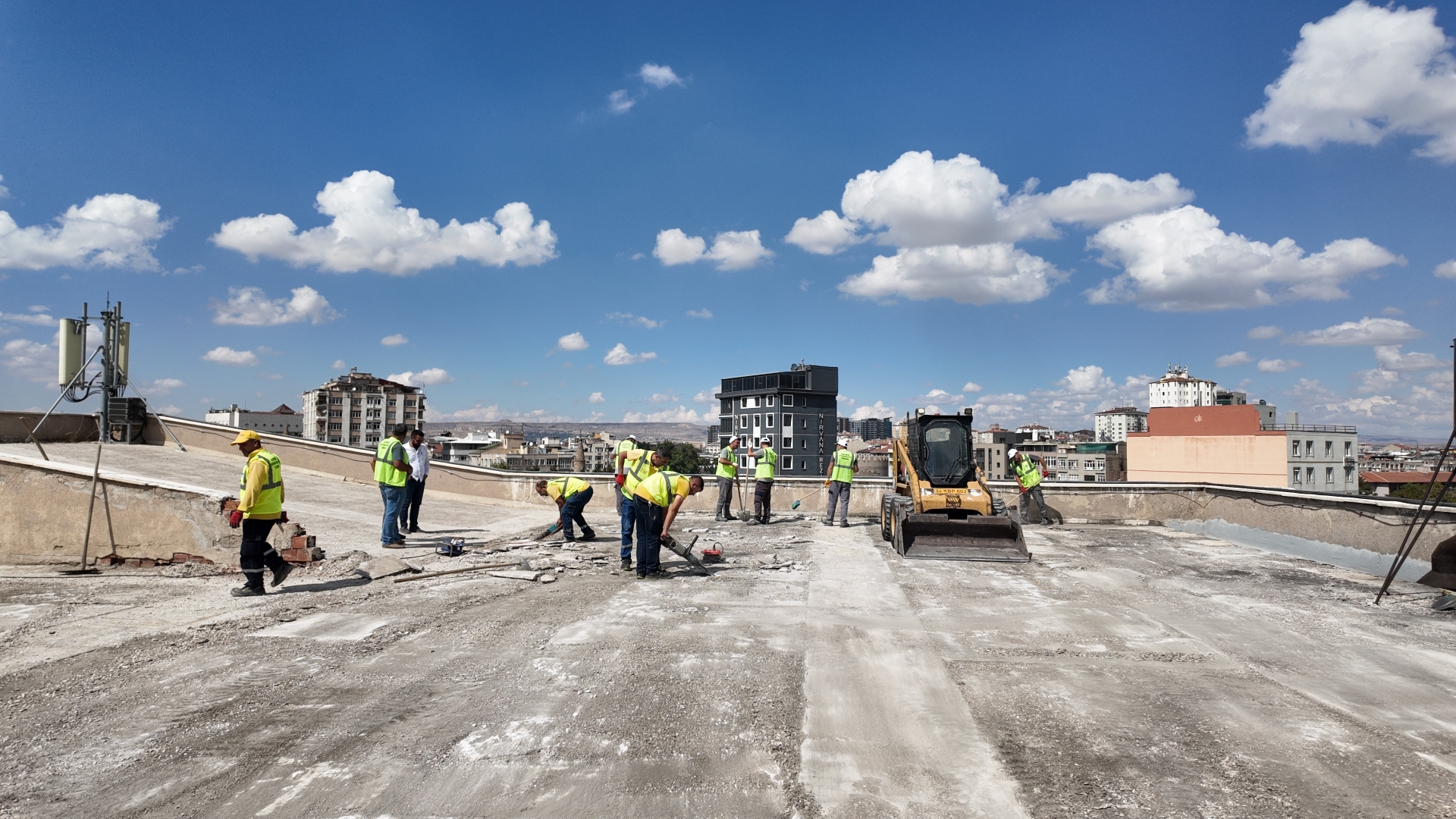 Büyükşehir Belediyesi ekipleri, zamanla yıpranan beton çatı yüzeyinin zarar gören kısımlarının temizliğini yaparak çalışmalara başladı.