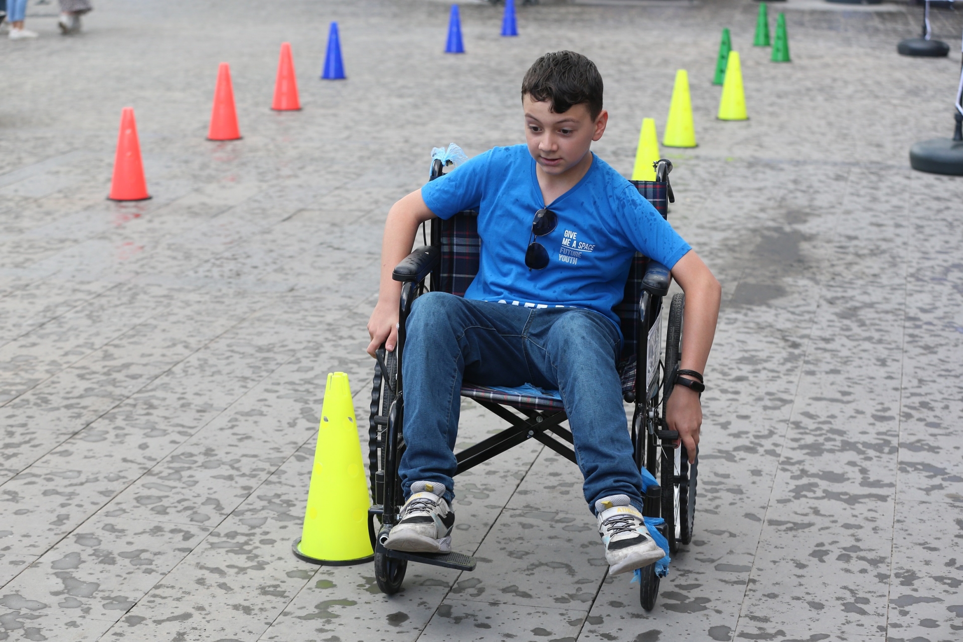 çocuğun tekerlekli sandalyeyi denediğini, sonrasında da “böyle yaşamak çok