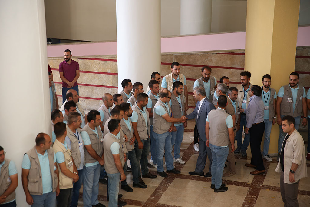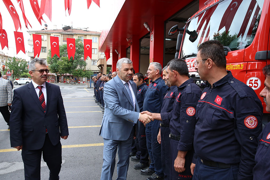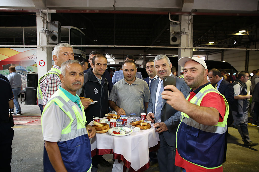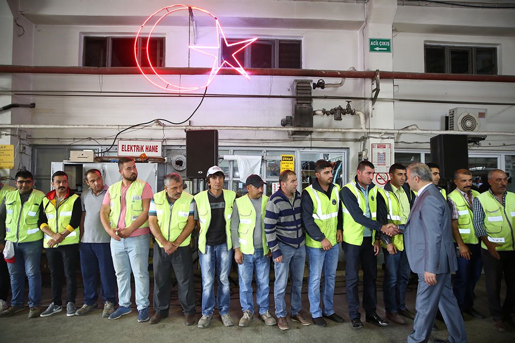 Büyükşehir Belediye Başkanı Mustafa Çelik, bayram sonrası ilk mesai gününde personelle bayramlaştı. Başkan Çelik, Büyükşehir Belediyesi hizmet binası, ek binalar ve KASKİ ile birlikte binlerce personelle tek tek bayramlaştı. Büyükşehir Belediye Başkanı Çelik, mutlu ve huzurlu personelle Kayseri’ye hizmette kusur etmeden çalıştıklarını söyledi. Büyükşehir Belediye Başkanı Mustafa Çelik, mesai saatinin başlamasıyla birlikte önce Makine İkmal Bakım ve Onarım Daire Başkanlığı'nda personelle bayramlaştı. Bayramlaşmaya Park Bahçe ve Ağaçlandırma Dairesi ile Fen İşleri Dairesi personeli de katıldı. Başkan Çelik, daire başkanları, müdürler ve tüm personelle tek tek bayramlaştı. “HİZMETTE KUSUR ETMEDEN ÇALIŞIYORUZ” Makine İkmal’de personele hitap eden Büyükşehir Belediye Başkanı Çelik, kazasız belasız nice bayramlar temennisinde bulundu. İşletmelerin başarısının çalışanların huzuru ve mutluluğu ile doğru orantılı olduğunu vurgulayan Başkan Çelik, “Belediyelerde de durum böyle. Sizlerin huzuru ve mutluluğunu temin etmeye çalışıyoruz. 3,5 sene gibi kısa sürede bu kadar çok işi ve devasa projeleri yapmayı başarabildiysek mutlu bir çalışma ortamını sağladığımız içindir. Biz bugünkü moda tabiriyle çalışma barışını inandığımız değerler gereği sağlıyoruz. Çalışanın hakkını alnının teri kurumadan vermek gerektiğini belirten bir dinin mensuplarıyız. Biz birlikte bir ekibiz. 5 bin kişilik kadroyuz ve beş bin kişilik gücüz. Bu gücümüzü de şehrimiz için kullanıyoruz. Rabbim nice bayramlara ailenizle sevdiklerinizle erişmeyi nasip etsin. Bundan önce olduğu gibi bundan sonra da hizmette kusur etmeden çalışacağız” dedi. Büyükşehir Belediye Başkanı Çelik, Makine İkmal Atölyesi’nde geleneksel hale getirdiği şekliyle çalışanlarla birlikte simit, kete ve peynir ile kahvaltı yaptı. Gruplar halinde personelle sohbet eden Başkan Mustafa Çelik, bayram tatilini nasıl geçirdiklerini sordu ve bol bol hatıra fotoğrafı çektirdi. İTFAİYE’DE BAYRAMLAŞMA Büyükşehir Belediye Başkanı Mustafa Çelik, Makine İkmal Bakım ve Onarım Daire Başkanlığı'ndaki bayramlaşmanın ardından İtfaiye Teşkilatına geçti. İtfaiye Daire Başkanlığı’nda yöneticiler ve personelle tek tek bayramlaşan Başkan Çelik, itfaiye personeliyle toplu fotoğraf çektirdi ve çalışmalarla ilgili bilgiler aldı. ÖNCE BAYRAMLAŞMA SONRA TOPLANTI Büyükşehir Belediye Başkanı Çelik, İtfaiye’nin ardından KASKİ Genel Müdürlüğü’ne geçerek personelle bayramlaştı. KASKİ girişinde personelle bayramlaşan Başkan Çelik, katları da gezdi. Büyükşehir Belediye Başkanı Çelik, daha sonra KASKİ yöneticileri ile bir toplantı gerçekleştirdi. BELEDİYEYE GELEN VATANDAŞLARLA DA BAYRAMLAŞTI KASKİ çalışanları ile bayramlaştıktan sonra Büyükşehir Belediyesi hizmet binasına geçen Başkan Mustafa Çelik, belediye içersindeki tüm birimleri tek tek gezerek çalışanlarla bayramlaştı. Tüm katları gezen Başkan Çelik, işi nedeniyle belediyeye gelen vatandaşlarla da bayramlaşarak bir süre sohbet etti. Büyükşehir Belediye Başkanı Çelik, daha sonra belediye hizmet binası yanında faaliyet gösteren KAYMEK, Sosyal Hizmetler Daire Başkanlığı ve Kentsel Dönüşüm Daire Başkanlığı’nı da ziyaret ederek bayramlaşmasını sürdürdü. Başkan Çelik, Kentsel Dönüşüm Daire Başkanlığı’nda Sahabiye Projesi 2. Uygulama Etabı uzlaşma görüşmeleri ile ilgili bilgi aldı. Büyükşehir Belediye Başkanı Çelik, personelle bayramlaşmasını ulaşım ekibi ile çağrı merkezi çalışanlarıyla sürdürdü. Başkan Çelik, çağrı merkezi personeli ile bir süre sohbet etti. Büyükşehir Belediye Başkanı Çelik, son olarak başkanlık katındaki personelle bayramlaştı ve tüm çalışanların sağlık ve huzurla nice bayramlara ulaşması temennisinde bulundu.