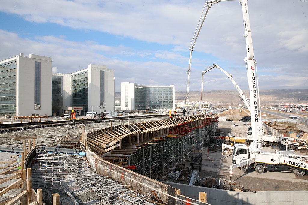 Büyükşehir Belediye Başkanı Dr. Memduh Büyükkılıç, Şehir Hastanesi önünde yapım çalışmaları devam eden katlı kavşağın dördüncü kolunu yerinde inceledi. Olumsuz hava koşullarına rağmen devam eden çalışmaların son durumuna ilişkin bilgiler alan Başkan Memduh Büyükkılıç, iki ay içinde dördüncü kolun tamamlanacağını söyledi.