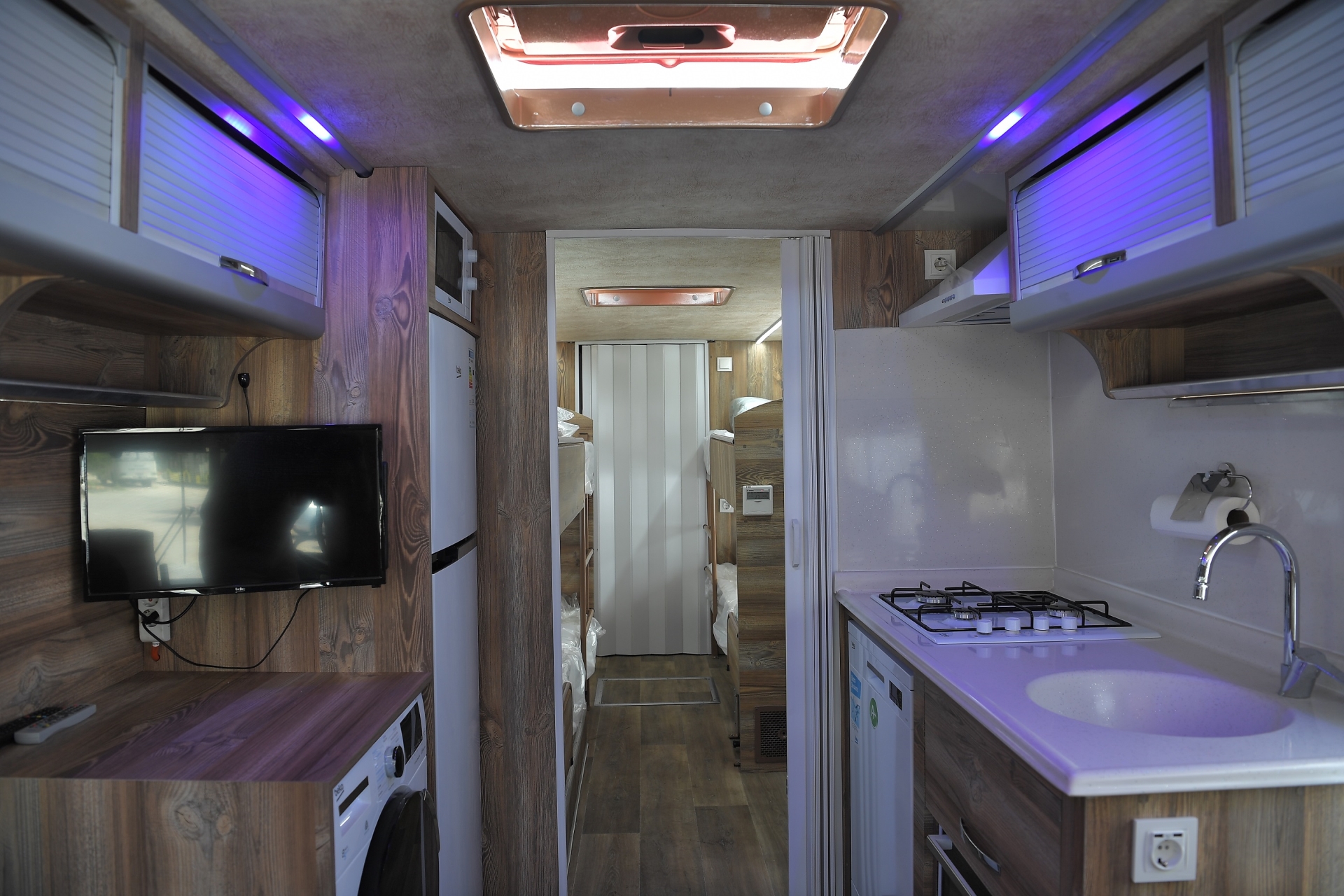 banyosu, yatakları, mutfağı, dinlenme ortamı ve direksiyon yanındaki yardımcı