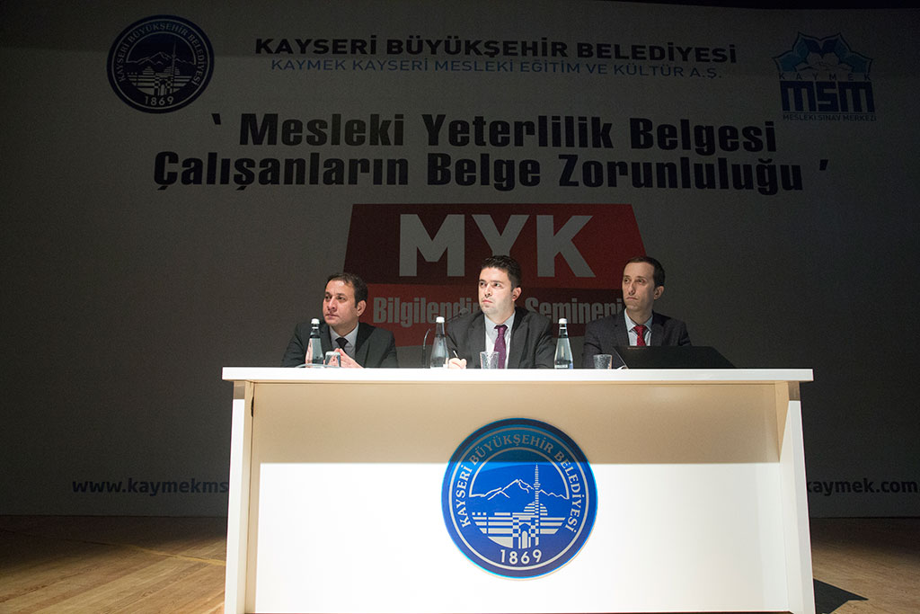 Büyükşehir Belediyesi bünyesindeki KAYMEK Mesleki Sınav Merkezi, Mesleki Yeterlilik Kanunu ile ilgili bilgilendirme semineri düzenledi. Şehir Tiyatrosu’nda düzenlenen seminere Mesleki yeterlilik Kurumu uzmanları katıldı. 5544 Sayılı Mesleki Yeterlilik Kanunu kapsamında Çalışma ve Sosyal Güvenlik Bakanlığı’nın tebliğleriyle 81 meslekte getirilen belge zorunluluğuna ilişkin tüm bilinmeyenler KAYMEK Mesleki Sınav Merkezi tarafından düzenlenen seminerde ele alındı. ‘’Mesleki Yeterlilik Belgesi-Çalışanların Belge Zorunluluğu’’ konulu Mesleki Yeterlilik Kanunu Bilgilendirme Semineri’ne Mesleki Yeterlilik Kurumu (MYK) Sınav ve Belgelendirme Dairesi Başkanı Mehmet Ordu Kaya ve MYK Sınav ve Belgelendirme Uzman Yardımcısı Yaşar Tuna Zorlu katıldı Seminerde konuşan MYK Sınav ve Belgelendirme Dairesi Başkanı Mehmet Ordu Kaya, yaklaşık 10 yıldır çalışma hayatına politikalar üreten bir kamu kuruluşu olduklarını söyledi. Mesleki Yeterlilik Kurumu hakkında bilgi veren Kaya, Mesleki Yeterlilik Kurumu’nun mesleklere standart getiren ve bu mesleklere göre yeterlilik veren bir kurum olduğunu söyledi. Kaya, mesleklere belge zorunluluğu ile ilgili açıklamalarında Kayseri’de KAYMEK Mesleki Sınav Merkezi ile birlikte iki ayrı belgelendirme kuruluşu olduğunu ve çok başarılı çalıştıklarını söyledi. Mehmet Ordu Kaya, mesleki yeterlilik belgesi almak isteyenlerin sınav ve belgelendirme masraflarını işsizlik sigortasından karşıladıklarını ve bugüne kadar 275 bin kişinin belge aldığını kaydetti. Seminere katılan Sınav ve Belgelendirme Uzman Yardımcısı Yaşar Tuna ise, belge zorunluluğu kapsamındaki meslekler, sınav merkezleri ve belgelendirmenin safhalarıyla ilgili açıklamalarda bulundu. KAYMEK Mesleki Sınav Merkezi Müdürü Burhan Çanakpınar da konuşmasında KAYMEK MSM hakkında açıklamalarda bulundu. KAYMEK MSM binası için örnek bir projenin yapımının sürdüğünü dile getiren Çanakpınar, “Mayıs ayı ile birlikte 4 bin metrekaresi kapalı olmak üzere yaklaşık 10 bin metrekare alanda şehrimize, bölgemize ve ülkemize hizmet vereceğiz” dedi.