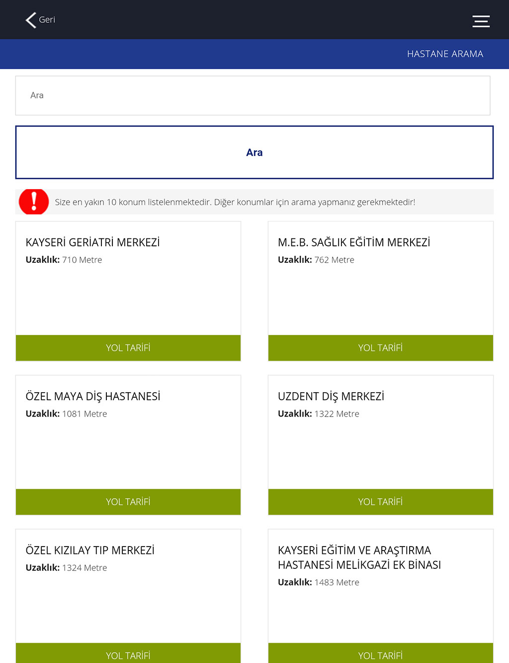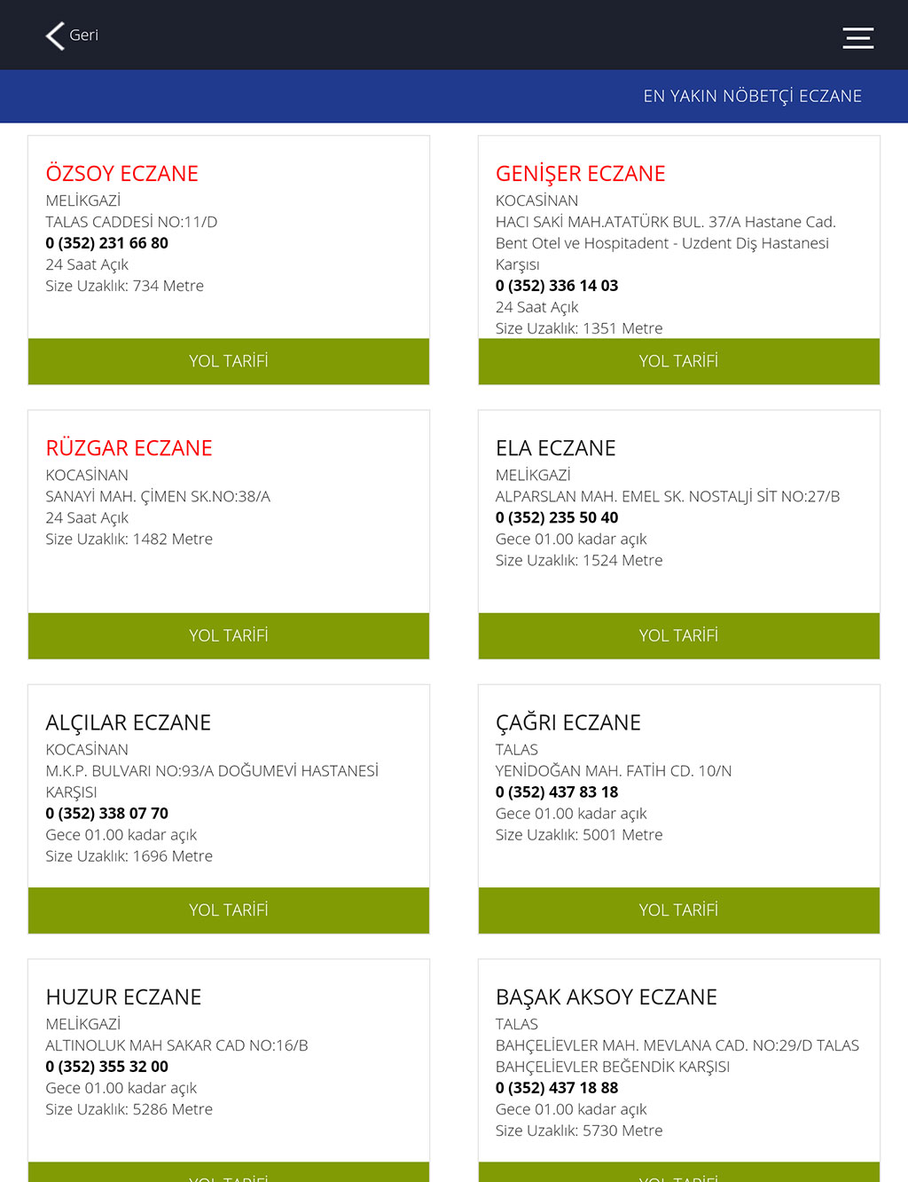 Nöbetçi eczanelere ihtiyacımızın olduğu saatlerde yardımımıza koşan “Nöbetçi Eczaneler” menüsü Nöbetçi eczanelerin adı, adresi, konumu ve telefonu hakkında bilgi veriyor. Eğer nöbetçi eczanelerin adreslerinden hiçbirinin adresini bilmiyorsanız akıllı telefonunuzun konum bilgisini aktif ederek size en yakın eczaneleri listeleyebilir ve yol tarifi alabilirsiniz. Eczane bilgilerini telefonunuzun rehberinde yer alan ikinci bir kişiyle paylaşabilir kişinin ekstra zaman kazanmasını sağlayabilirsiniz.