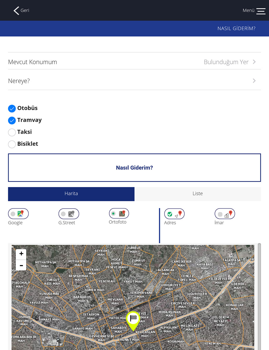 - Şehrin herhangi bir noktasından başka bir noktasına gitmek istiyorsunuz. Ama hangi otobüse neren bineceğinizi, nasıl gideceğinizi, nerede, nasıl ve kaç aktarma yapacağınızı bilmiyorsunuz. Nereden nereye menüsü size yeterince yardımcı olacaktır. İster liste şeklinde isterseniz harita üzerinde tüm bu bilgilere kolaylıkla ulaşabilirsiniz.