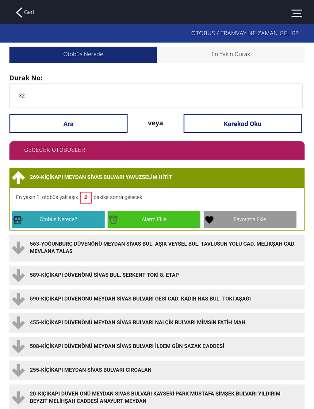 - Herhangi bir durakta durak numarası ile sorgulama yaparak o duraktan geçen otobüsleri görebilir otobüsün durağınıza ne zaman geleceğinizi öğrenebilirsiniz. Eğer durak numarasını bilmiyorsanız telefonunuzun konum bilgisini açarak size en yakın durakların listesini görebilir yine o duraktan geçen otobüsleri ve gelme sürelerini öğrenebilirsiniz. Ayrıca duraklara yerleştirilen karekodu akıllı telefonunuz yardımıyla herhangi harici bir program kullanmadan uygulamanın kendi içerisinden okutarak durak numarasının girişine gerek kalmadan duraktan geçen otobüslerin listesini ve süresini görebilirsiniz.