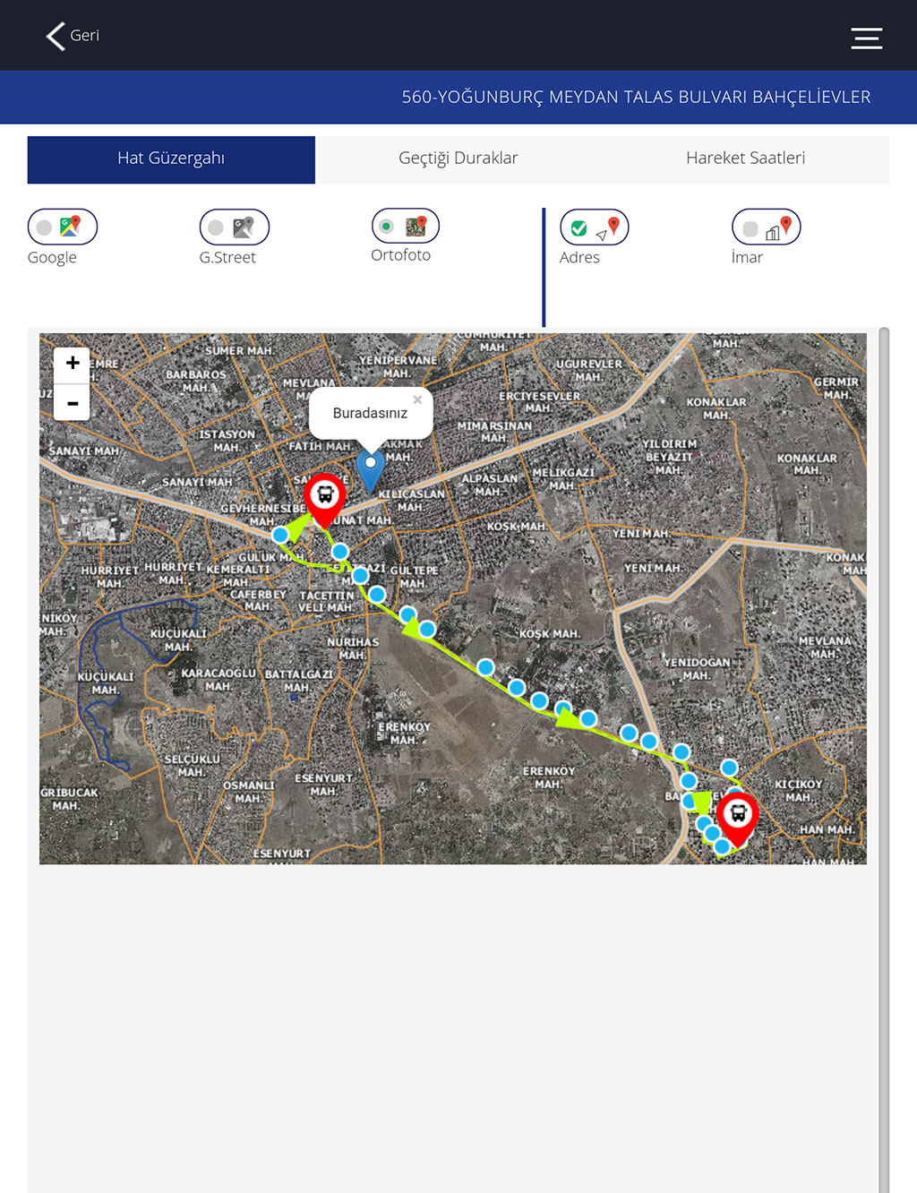 Mobil Uygulamanın “Ulaşım” menüsünden hat güzergahlarını, hareket saatlerini, güzergah üzerindeki durakları ve isimlerini, o hat üzerinde varsa otobüslerin konumlarını, otobüsün en son nereden kaç km hızla geçtiğini, en yakın bilet satış noktalarını, otobüs ve tramvay duraklarındaki en yakın bisiklet duraklarını ve en yakın taksi durağını görmek de mümkün.