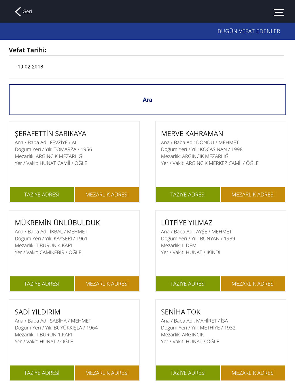 Günlük vefat eden kişilerin bilgilerine ayrıca bu kişilere ait mezar adresine ve taziye adresine ulaşmak istediğinizde “Bugün Vefat Edenler” menüsünden yararlanabilirsiniz. Vefat eden kişiyi tanıyorsunuz ancak define yetişemediniz eve taziyeye gitmek istiyorsunuz bu durumda mobil uygulamamızı kullanarak uygulamadan yol tarifi alarak taziye evini kolay bir şekilde ziyaret edebilirsiniz. Ayrıca vefat edenlerin yanı sıra mezarlıkta herhangi bir tapunuz varsa ada / pafta bilgilerine ulaşabilir ve yol tarifi alabilirsiniz.