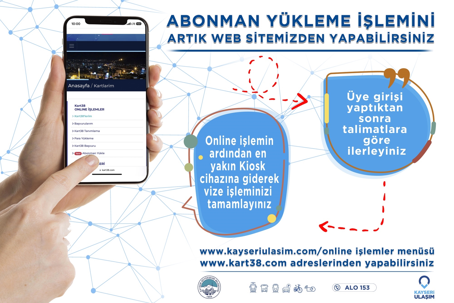 Abonman yükleme işlemi online olarak, http://kart38.com yada http://kayseriulasim.com adreslerinden yapılabilirken, yükleme işleminin ardından en yakın kiosk cihazlarından vize işlemi tamamlanabilecek.