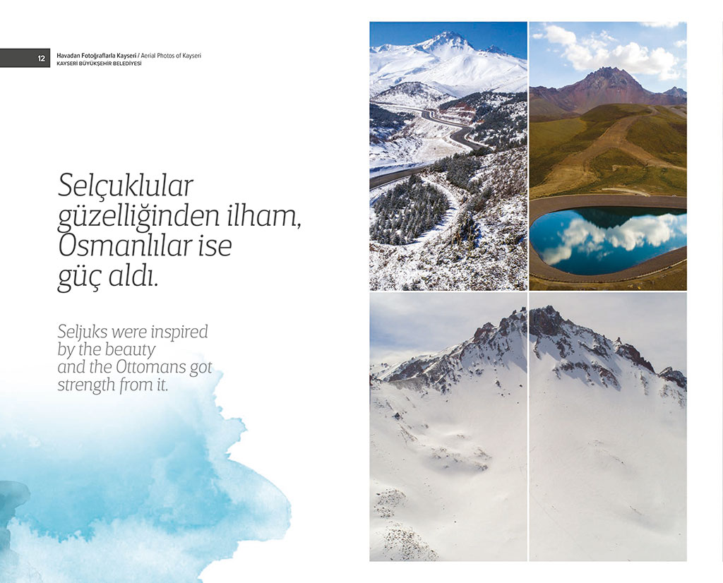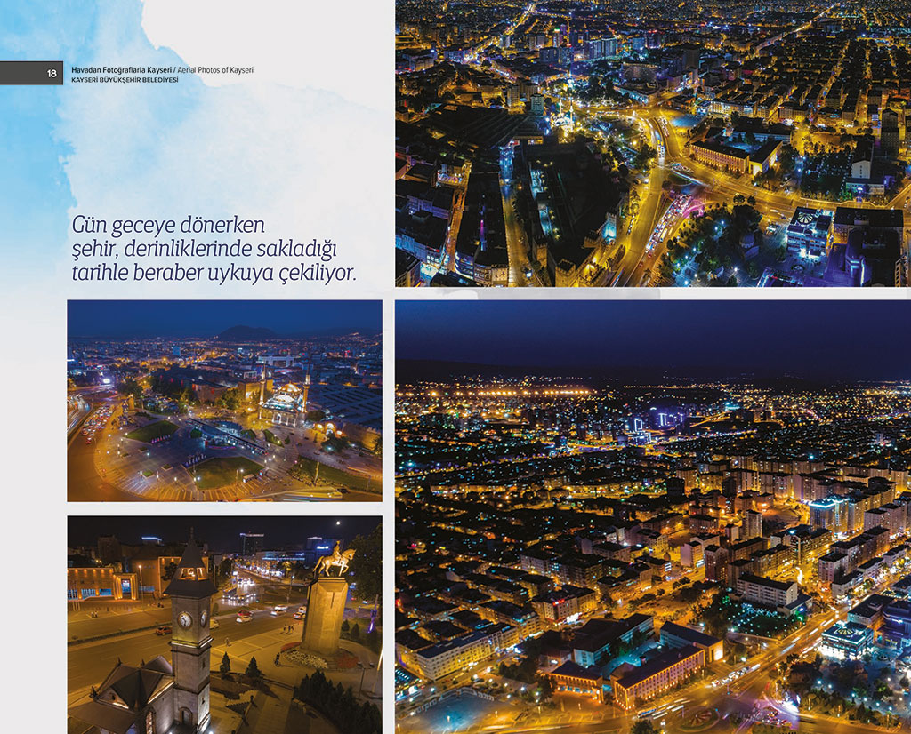 Kayseri’nin tanıtılmasına büyük önem veren Büyükşehir Belediyesi, Kayseri’nin tüm güzelliklerini ortaya koyan prestij bir eseri daha şehrimize kazandırdı. “Havadan Fotoğraflarla Kayseri” adlı eserde, Kayseri’den; Selçukluların güzelliğinden ilham, Osmanlıların ise güç aldığı belirtiliyor ve bu güzellikleri yansıtan fotoğraflara yer veriliyor. Büyükşehir Belediyesi, kütüphanelerin en güzel eserlerinden birisi olacak olan “Havadan Fotoğraflarla Kayseri” adlı eserle şehrimizin tanıtımına katkı vermeyi sürdürdü. Büyükşehir Belediye Başkanı Mustafa Çelik, eserin ön sözünde bir belediyenin kitapla olan ilişkisinin aynı zamanda kültür, sanat ve medeniyetle olan ilişkisini yansıttığını söyledi. Bu şuur içerisinde şehrimize yeni eserler kazandırdıklarını ifade eden Başkan Çelik, “Yayınladığımız kitaplarla, içinden geldiğimiz ve kendisine hizmet ettiğimiz insanların ruh ve gönül dünyalarını doyurmak, onların kültürel ve sanatsal kaygılarına da hizmet etmek zorundayız” dedi. “SELÇUKLULAR GÜZELLİĞİNDEN İLHAM, OSMANLILAR GÜÇ ALDI” Büyükşehir Belediyesi tarafından bastırılan “Havadan Fotoğraflarla Kayseri” adlı eserde Erciyes’ten Cumhuriyet Meydanı’na, tarihi eserlerimizden Soğanlı’ya, Sultansazlığı’ndan Aladağlar’a, Büyükşehir Belediyesi’nin yaptırdığı köprülü kavşaklardan Harikalar Diyarı’na kadar pek çok güzelliğin havadan çekilmiş fotoğrafları bulunuyor. Eserde, bu güzelliklerle ilgili Türkçe ve İngilizce bilgiler de yer alıyor. “Havadan Fotoğraflarla Kayseri” adlı eserde Kayseri’nin Selçuklulara ilham, Osmanlılara güç verdiği vurgulanıyor.