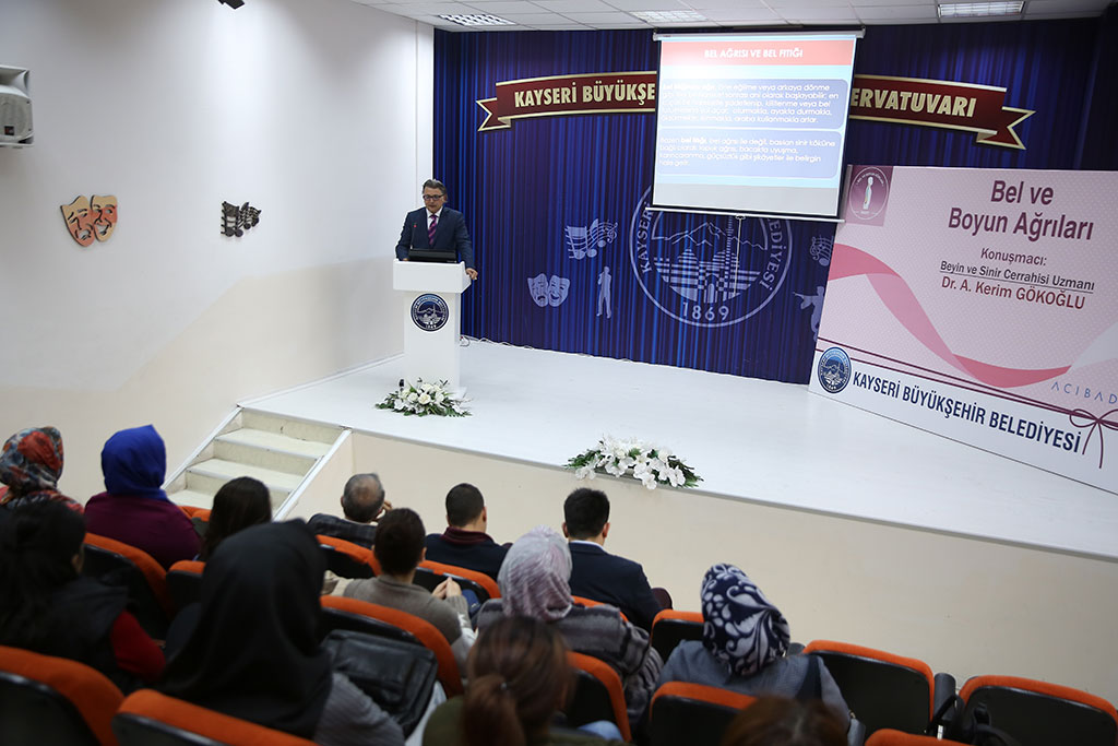 Büyükşehir Belediyesi sağlık seminerlerine devam ediyor. Sağlık seminerlerinde bu hafta Bel ve Boyun Ağrıları konusu ele alındı. Büyükşehir Belediyesi kültür sanat etkinlikleri çerçevesinde düzenlenen sağlık semineri Büyükşehir Belediyesi Konservatuarı Seminer Salonu’nda yapıldı. Seminere Beyin ve Sinir Cerrahisi Uzmanı Dr. Kerim Gökoğlu katıldı. Seminerde, öncelikle bel ve boyun ağrılarının sebepleri hakkında bilgi veren Dr. Kerim Gökoğlu, ağrıların fiziksel aktivitelerle artabileceğini; ancak istirahatlarla ağrıların azaltılabileceğini ifade etti. Dr. Kerim Gökoğlu, öne doğru eğilme, uzun süre ayakta kalma gibi günlük aktiviteleri de çok yakından değerlendirmek gerektiğini söyledi. Eklemlerdeki bozuklukların hareketle artarken, kanal darlığı veya sinirin geçtiği deliklerdeki daralmaların da uyuşmalar ve karıncalanmalara neden olabileceğini dile getiren Gökoğlu, bu ağrılar değerlendirilirken olayı bütün olarak ele alınması gerektiğini, önceden var olan düşmeler, trafik kazaları ya da doğumsal anomalilerin de ağrıları etkileyebileceği kaydetti.