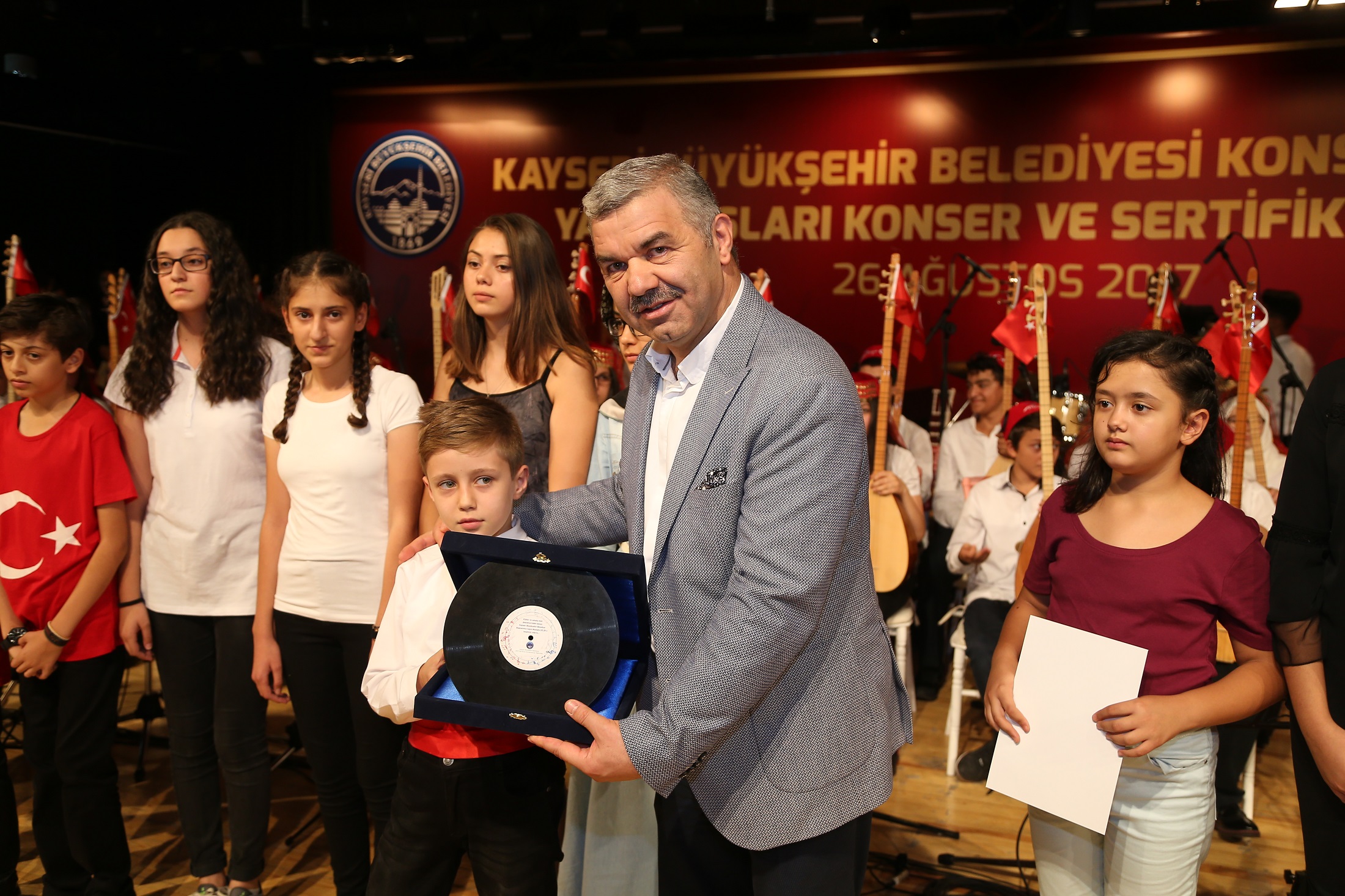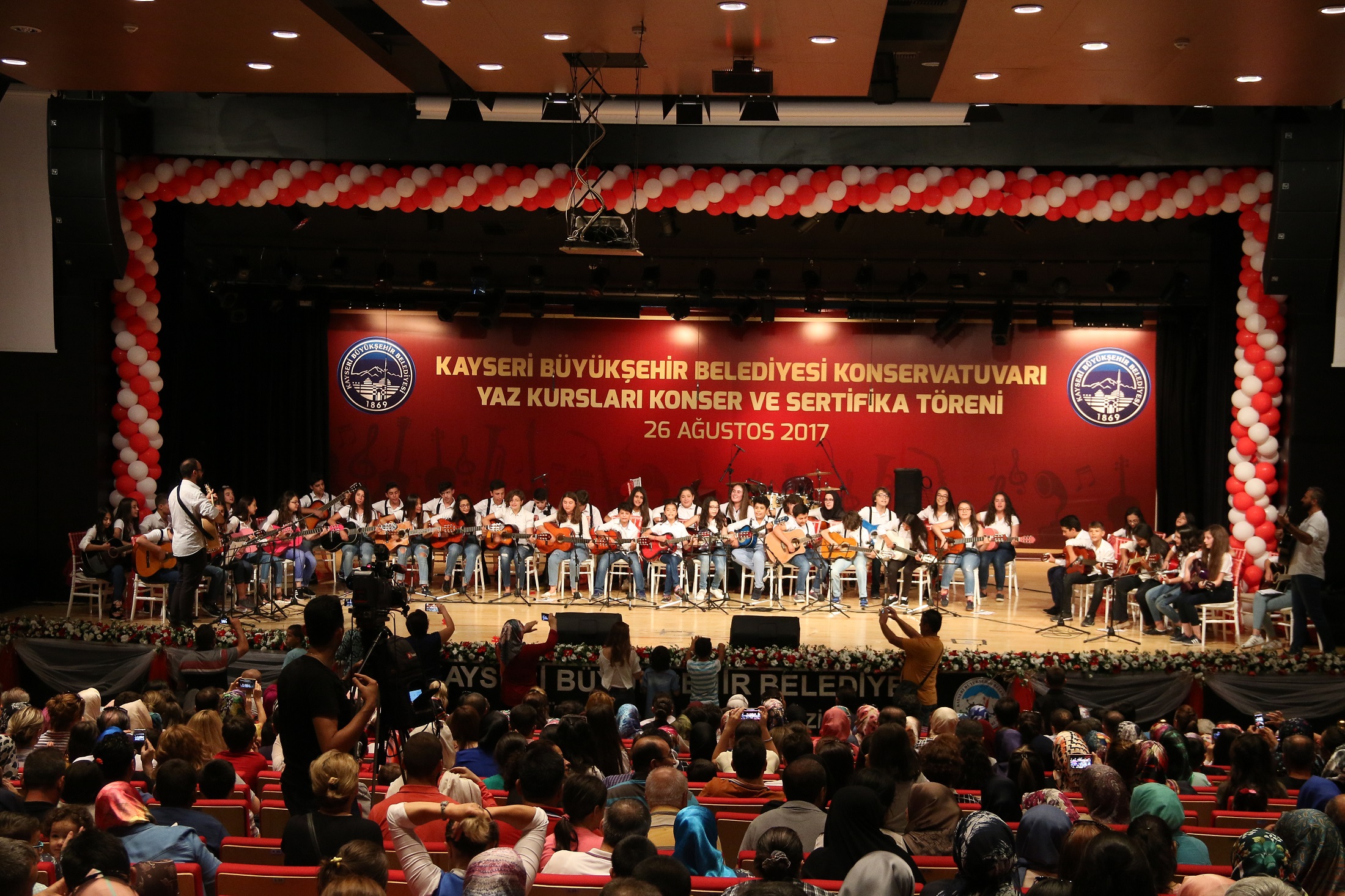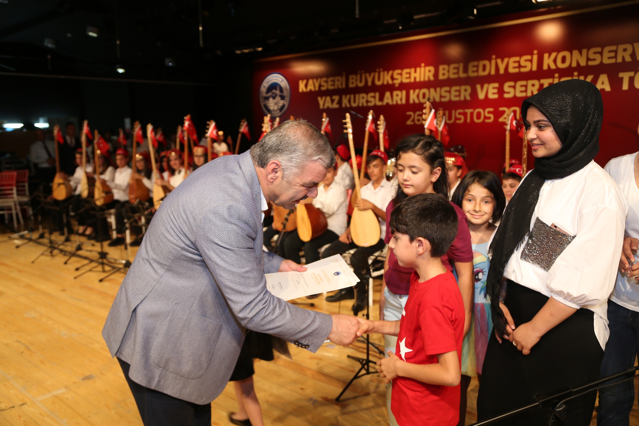 Büyükşehir Belediyesi sanata ve sanatçıya destek vermeye ve sanatçı adaylarının yetişmesi için imkanlar sunmaya devam ediyor. Yaz döneminde Büyükşehir Belediyesi Konservatuvarı’nın kurslarına katılan yaklaşık 2 bin 350 kişiye sertifikaları verildi. Sertifika Töreni ve Yıl Sonu Konseri’ne Büyükşehir Belediye Başkanı Mustafa Çelik de katılarak çocuklar ve ailelerini tebrik etti. Büyükşehir Belediyesi Konservatuvarı’nın yaz döneminin sona ermesi nedeniyle düzenlediği program Kadir Has Kültür ve Sanat Merkezi’nde yapıldı. Programa katılmak üzere Fuar alanına giden Büyükşehir Belediye Başkanı Mustafa Çelik, program saatini bekleyen gençlerle fuar alanında oturarak sohbet etti ve onların çaldığı şarkıları dinledi. Kadir Has Kültür ve Sanat Merkezi, konservatuvar kursiyerleri ve aileleri tarafından tamamen dolduruldu. Programın açılışında konuşan Büyükşehir Belediyesi Kültür ve Sosyal İşler Daire Başkanı Salih Özgöncü, her yıl kış ve yaz döneminde gerçekleştirdikleri kurslara farklı yaş ve farklı mesleklerden 5 binden fazla kişinin katıldığını söyledi. Özgöncü, çocukların ve gençlerin iyi bir yaz dönemi geçirmelerini sağladıklarını belirterek, sertifika almaya hak kazananları tebrik etti. Büyükşehir Belediye Başkanı Mustafa Çelik de konuşmasında sadece fiziki anlamda değil her alanda alt yapı hizmeti verdiklerini belirtti. Sporda, kültür ve sanatta, bilimde ve diğer alanlarda güçlü bir altyapı kurma gayreti içinde olduklarını vurgulayan Başkan Çelik, “Kayseri’den daha çok sanatçı, daha çok sporcu, daha çok bilim adamı çıkmasını arzu ediyoruz. Bunun tek yolu da sanatla, sporla, bilimle uğraşan insan sayısını artırmaktan geçiyor. İsteyen herkese bu imkanları sunmaktan geçiyor. Bu sebeple daha çok gencimizin spor yapması için imkanlar sağlıyoruz. Daha çok gencimizin bilime merak duyması için Bilim Merkezi kuruyor, onlara bilimsel çalışma yapma fırsatı tanıyoruz. Ve daha çok gencimizin bir sanat dalıyla ilgilenmesi için imkanları artırıyoruz. Bunun sonucunda da bu yıl geçen yıllardan çok daha fazla insanımıza bir sanat dalıyla ilgilenme fırsatı verdik. Yaz döneminde Büyükşehir Belediyemiz yanındaki Konservatuvar binamız ve Tarihi Kayseri Mahallesi’nde açtığımız Konservatuvarımızın Setenönü Şubesi ile birlikte 2 bin 350 kişiye dokuz ayrı branşta kurslar verilmesini sağladık. Bu yıl ayrıca önceki yıllarda olduğu gibi sadece 9-15 yaş grubundaki öğrencilerimizi değil 16 yaş üstü sanat severleri de yaz kurslarımıza aldık. Böylece her yaş grubundan sanata ilgi duyanlara fırsat tanımış olduk. Bu arada kış dönemi kurslarımız için kayıtlarımız da devam ediyor. Kış döneminde 20 ayrı branşta yaklaşık 3 bin kişiye kurs imkanı vereceğiz. Dolayısıyla bir yıl içinde sadece Büyükşehir Belediyesi olarak 5 binin üzerinde kursiyerimizi bir sanat dalında yetiştirmiş olacağız. Şehrimizdeki sanat ve sanatçı altyapısına katkı işte böyle olur. Bu gayretler inanıyorum ki gelecekte ilimizden daha çok sanatçının çıkmasını sağlayacaktır” dedi. BAŞKAN’DAN ÇOCUKLARA VE AİLELERİNE ÇAĞRI Konuşmasında çocuklarımıza ve ailelerine bir çağrıda da bulunan Başkan Mustafa Çelik, sözlerini şöyle sürdürdü: “Mutlaka herhangi bir sanat dalıyla ilginiz olsun. Mutlaka bir spor dalıyla ilgilenin. Emin olun ilgilendiğiniz sanat veya spor dalı hayatınızın her döneminde sizin bir adım önde olmanızı sağlayacaktır. Kendinizi geliştirmek ve daha sosyal bireyler olmak için attığınız her adımda Kayseri Büyükşehir Belediyesi’nin yanınızda olacağını belirtmek isterim.” Başkan Mustafa Çelik, sözlerinin sonunda yaz kurslarından mezun olan öğrencileri ve çocuklarını bu kurslara yönlendiren aileleri tebrik etti. Büyükşehir Belediye Başkanı Çelik, konuşmaların ardından bir grup öğrenciye sertifikalarını verdi. Öğrenciler de Başkan Çelik’e çiçek ve teşekkür plaketi takdim etti. Sertifikaların verilmesinin ardından yaz kurslarına katılan tüm öğrenciler grup grup sahneye çıkarak konser verdiler.
