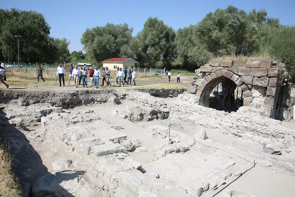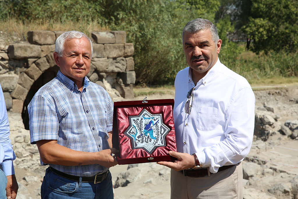 Ziyaret sırasında Kazı Heyeti Başkanı Prof. Dr. Ali Baş, Büyükşehir Belediye Başkanı Mustafa Çelik’e kazı çalışmalarında çıkan çinilerden birisinin replikasını hediye etti.