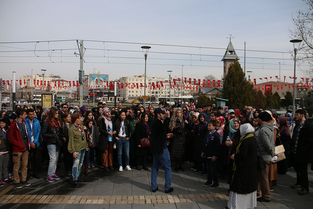 Büyükşehir Belediyesi birbirinden güzel sosyal etkinliklerine devam ediyor. Hafta sonu Kayseri’nin tarihi eserlerinin tanıtımı için Kültür Yolu Gezisi düzenlendi. Geziye katılanlar Kayseri’nin tarihi değerlerine ilişkin önemli bilgiler edindi. Büyükşehir Belediyesi mart ayı kültür sanat etkinliklerine Kültür Yolu Gezisiyle devam edildi. Geziye katılanlar Kayseri’nin tarihi ve kültürel açıdan ne denli zengin bir şehir olduğunu bir kez daha gördüler. Rehber eşliğinde yapılan gezi Selçuklu Uygarlığı Müzesi’ne dönüştürülen Gevher Nesibe Medresesi’nden başladı. Daha sonra Sahabiye Medresesi, Cumhuriyet Meydanı, Kayseri Kalesi, Hunat Külliyesi güzergahında devam eden gezide Kiçikapı’dan Kayseri Lisesi Milli Mücadele Müzesi’ne geçildi. Kayseri’nin tarihine güzel bir yolculuk yaptıran gezinin son durağı ise Kayseri Mahallesi oldu. Geziye katılanlar keyifli dakikalar geçirdi.