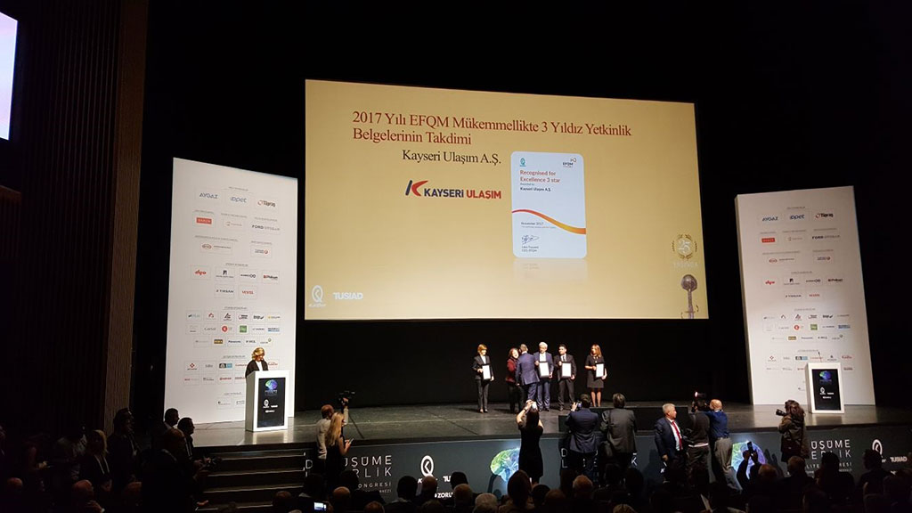 2015 yılında Türkiye Kalite Derneği, KalDer ile imzalanan protokol ile mükemmellik yolculuğuna başlayan Büyükşehir Belediyesi Kayseri Ulaşım A.Ş. hedefine bir adım daha yaklaştı. Kayseri Ulaşım, KalDer denetmenleri tarafından yapılan EFQM (European Foundation For Quality Management) mükemmellik modeli denetimlerinden başarıyla geçerek "Mükemmellikte Yetkinlik 3 Yıldız Belgesi" ile ödüllendirildi. Türkiye Kalite Derneği (KalDer) ve TÜSİAD iş birliğiyle düzenlenen "2017 Türkiye Mükemmellik Ödülleri" sahiplerini buldu. İstanbul’daki Zorlu Performans Sanatları Merkezi’nde düzenlenen törene; Kayseri Ulaşım A.Ş. Genel Müdürü Feyzullah Gündoğdu katıldı. Törende Türkiye’nin çeşitli bölgelerinden birçok kurumsal firma ve 2 bine yakın katılımcı yer aldı. Gündoğdu’ya törende "Mükemmellikte Yetkinlik 3 Yıldız Belgesi" takdim edildi. Ulaşım A.Ş. Genel Müdürü Feyzullah Gündoğdu yaptığı değerlendirmede, Kayseri Ulaşım olarak 2015 yılında mükemmellik modelini kurumlarında uygulamaya başladıklarını belirtti. İlk yıl yapılan denetimlerde 2 yıldız ile "Mükemmellikte Kararlılık Belgesi" aldıklarını ifade eden Gündoğdu, “Geçen süre içinde modeli uygulamaya devam ettiklerini, toplumu, paydaşları ve çalışanları ilgilendiren birçok konuda yeni uygulamalar yaptıklarını söyledi. Bu yıl yapılan denetimlerde de 3. yıldızı almaya hak kazandıklarını vurgulayan Gündoğdu, “EFQM mükemmellik modelinin uygulanmasında büyük katkı çalışanlarımıza aittir. Çalışma arkadaşlarımı emeklerinden dolayı kutluyorum. Yalnızca işimizi, üretimimizi geliştirmek için değil, kurumsal olarak da kendimizi geliştirmek için çok büyük gayret ortaya koyuyoruz. Bu yolda belirlediğimiz hedeflere kararlılıkla yol alarak aşama aşama ulaşıyoruz. İyi olmanın, mükemmelliğin bir sınırı yok. Hizmet kalitemizdeki mükemmelliği sürekli kılmak için çalışmaya devam edeceğiz. Hedefimiz 2019 yılında Mükemmellikte Yetkinlik 5 Yıldız Seviyesine ulaşmak ve Türkiye Büyük Ödülünü almaktır" dedi. “KALİTEMİZ TESCİLLENDİ” Büyükşehir Belediye Başkanı Mustafa Çelik, ulaşım alanında hem alt yapı yatırımları yaptıklarını hem de hizmet kalitesini ve yolcu memnuniyetini arttırmak için çalıştıklarını ifade etti. Kayseri Ulaşım A.Ş.’nin 2015 yılında başlattığı mükemmellik yolculuğunun da bu çalışmalardan sadece biri olduğunu vurgulayan Başkan Çelik, “Bu yıl alınan mükemmellikle kararlılık belgesi ile yaptığımız çalışmaların bağımsız denetçiler tarafından takdir edilmesi bizi gelecek yıllara daha özgüvenli ve kararlı bir şekilde gitmemizi sağlayacak ve motive edecektir” diye konuştu.