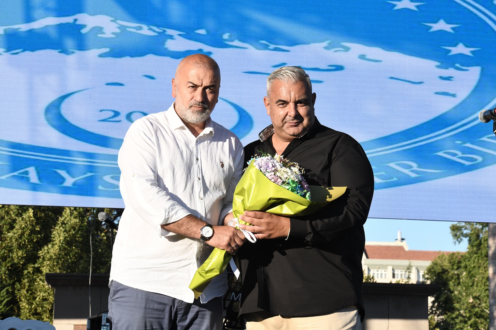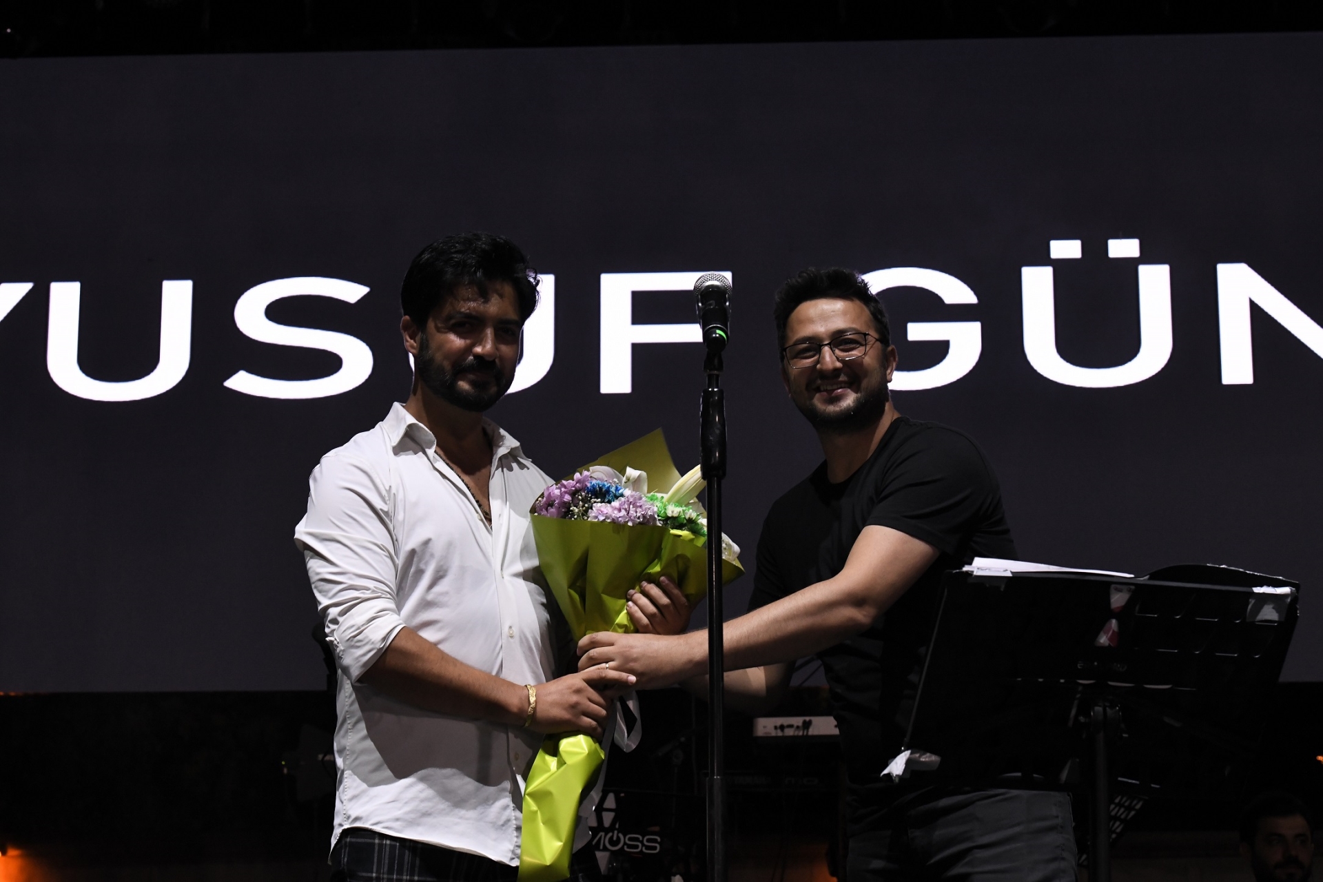 Salih Özgöncü de sevilen şarkıları seslendiren Yusuf Güney’e çiçek takdim