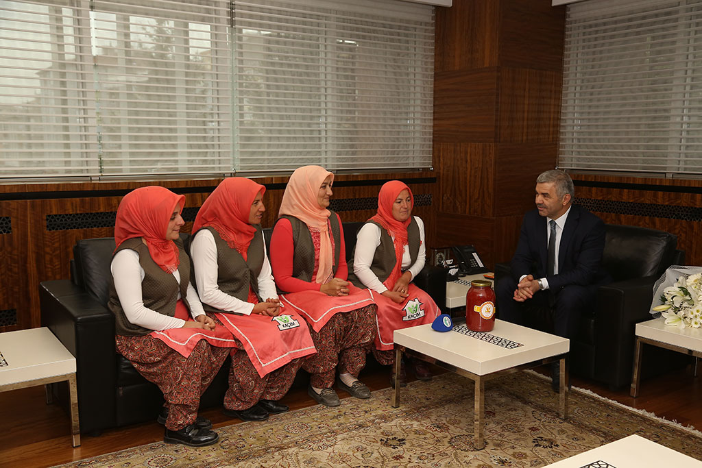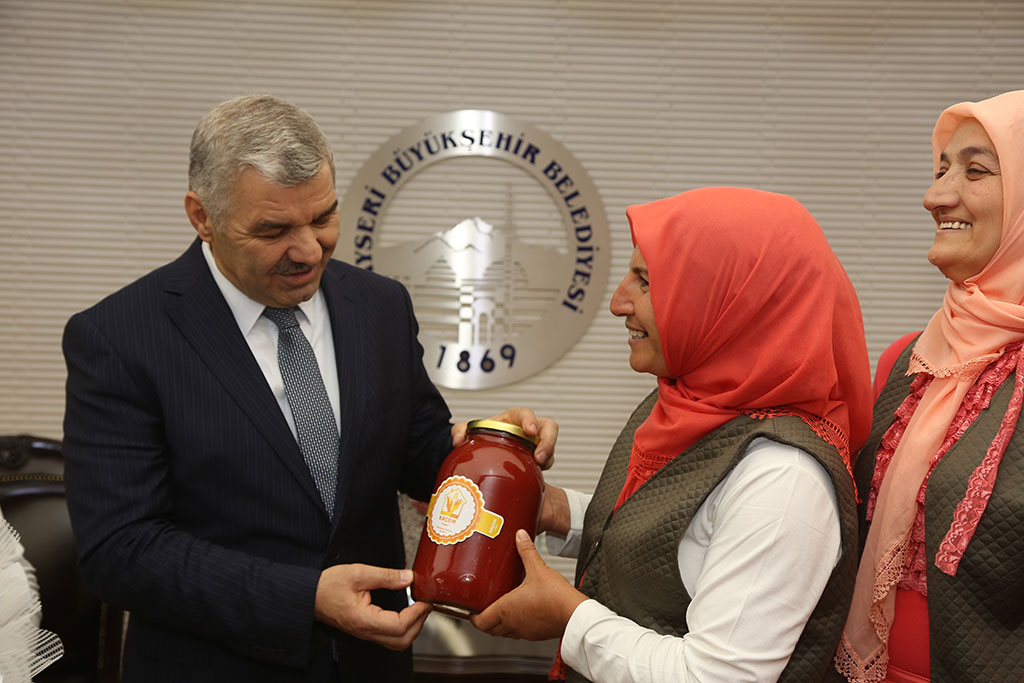 Büyükşehir Belediyesi’nin destekleriyle kurulan KAÇEM’in kadın girişimcileri, üretimleriyle ödüller kazanmaya başladı. Tarım ve Orman Bakanlığı’nın Tarımda Kadın Girişimciliğinin Güçlendirilmesi Programı kapsamında ödüle layık görülen ve ödülünü Cumhurbaşkanımız Recep Tayyip Erdoğan’ın eşi Emine Erdoğan’dan alan Yasemin Bayazıt, KAÇEM’in diğer girişimci kadınlarıyla birlikte Büyükşehir Belediye Başkanı Mustafa Çelik’i ziyaret etti. KAÇEM’li kadınlar bu noktaya Başkan Çelik’in verdiği desteklerle geldiklerini belirterek teşekkür ettiler. Tarım ve Orman Bakanlığı’nın 29 ilde yaptığı değerlendirme sonucunda “Domatesi Organik Yetiştirdim, Sihirli Bir Toza Dönüştürdüm” isimli projesiyle Türkiye birincisi olan ve birincilik ödülünü Cumhurbaşkanımız Recep Tayyip Erdoğan’ın eşi Emine Erdoğan’dan alan Yasemin Bayazıt, sihirli toza dönüştürdüğü projesiyle Büyükşehir Belediyesi’ne geldi. Büyükşehir Belediyesi’nin destekleriyle Bünyan-Karahıdır’da kurulan Kadın Çiftçiler Ekolojik Eğitim ve Üretim Merkezi (KAÇEM) çiftçisi olan Yasemin Bayazıt, KAÇEM’in diğer çiftçi kadınları ile Büyükşehir Belediye Başkanı Mustafa Çelik’i ziyaret ederek ödül töreninde yaşadıklarını paylaştılar. “BÜYÜKŞEHİR OLMASAYDI BUNLAR OLMAZDI” Ödül töreninde Cumhurbaşkanımızın eşi Emine Erdoğan’a takdim ettiği ödüllü projesi olan organik salçadan Büyükşehir Belediye Başkanı Mustafa Çelik’e de takdim eden Yasemin Bayazıt, “Salçayı geleneksel yöntemlerle organik domatesten yaptık. Kayseri’nin mantısı da salçasız olmaz. Hanımefendi bizimle çok ilgilendi. Emine Hanım ile Aile Çalışma ve Sosyal Politikalar Bakanımıza da takdim ettik. Takdim sırasında ‘Sumaklı mantıda kaldı nazarım, mantı yemeyeli sersem gezerim’ sözünü söyleyince Emine Hanım çok beğendi” diye konuştu. Ziyarette KAÇEM Başkanı Fatma Andaç, Cumhurbaşkanımızın eşi Emine Erdoğan’ın selamlarını ilettiğini belirtti. Hanımefendinin kendileriyle samimi bir şekilde yakından ilgilendiğini dile getiren Andaç, Başkan Çelik’e destekleri nedeniyle teşekkür ederek, “Bunlar sizin sayenizde oldu. Siz olmasaydınız bunlar olmazdı” dedi. Ödül kazanan Yasemin Bayazıt da, kendilerini şanslı çiftçi, kadınlar olarak gördüklerini ifade ederek, “Başkanım, bugüne kadar bizim yanımızda olmanız ve yaptığınız yardımlardan dolayı çok teşekkür ediyoruz. İnşallah Kayseri’deki kadın çiftçilere yardım ettiğiniz gibi diğer belediyeler de sizden örnek alırlar ve bizim gibi şanslı çiftçi kadınlar olur. Bizim amacımız KAÇEM olarak rol model olmaktı. Sayenizde bunu da başaracağımızı umuyorum” diye konuştu. KAÇEM üyesi diğer kadın girişimciler de Kayserili olmanın ayrıcalığını katıldıkları törende hissettiklerini ifade ederek Başkan Mustafa Çelik’e teşekkür ettiler. “BİZLERİ EN İYİ ŞEKİLDE TEMSİL ETTİNİZ” Büyükşehir Belediye Başkanı Mustafa Çelik, KAÇEM’i ve kadın girişimcileri tebrik etti. Yaptıkları çalışmaların olumlu sonuçlarını almaktan memnuniyet duyduklarını ve bu sonuçların kendilerini motive ettiğini ifade eden Başkan Çelik, “Organik tarıma başlarken, bu iş tutar mı tutmaz mı diyenler vardı. Ama klasik eski tarım ürünleri yerine daha fazla para getiren ve sağlıklı olan GDO’suz ürünleri bu şehre yerleştirmek zorundayız diyerek başladık. İlk yaptığımız proje Doğal Ürünler Bahçesi oldu. Ardından Kadın Çiftçiler Ekolojik Eğitim ve Üretim Merkezi ile dalga yayıldı. Şu an 2 bin 500 dekar alanda Kayserili kadınlar organik tarım yapıyor. Bu bizi çok sevindiriyor. Külliyede Hanımefendinin övgülerine mazhar olup ödül almak herkesin harcı değil. Bizleri en güzel şekilde temsil ettiğiniz için teşekkür ediyoruz” dedi. Büyükşehir Belediye Başkanı Çelik, KAÇEM’in girişimci kadınları tarafından üretilen organik ürünlerin tamamının Anadolu Harikalar Diyarı içindeki Organik Pazar’da satışa sunulduğunu da kaydetti.