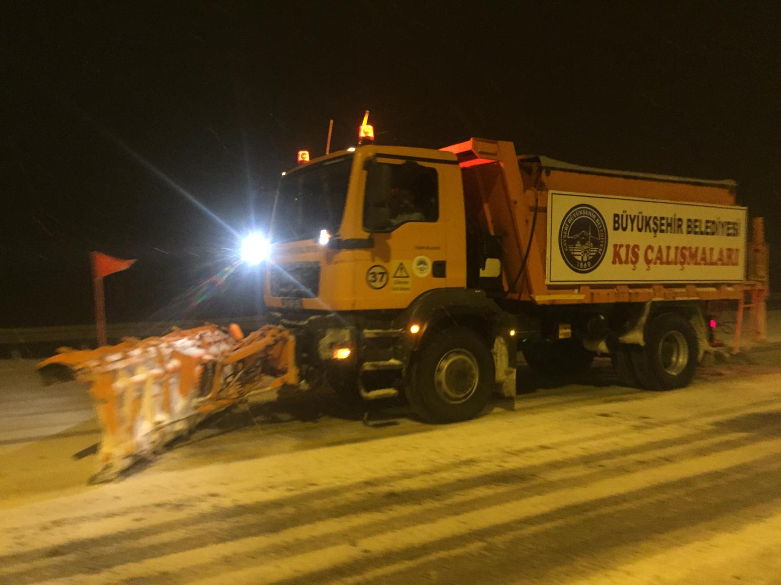 57 araç ile karla mücadele çalışması yapıyor. Bu kapsamda Büyükşehir Belediyesi