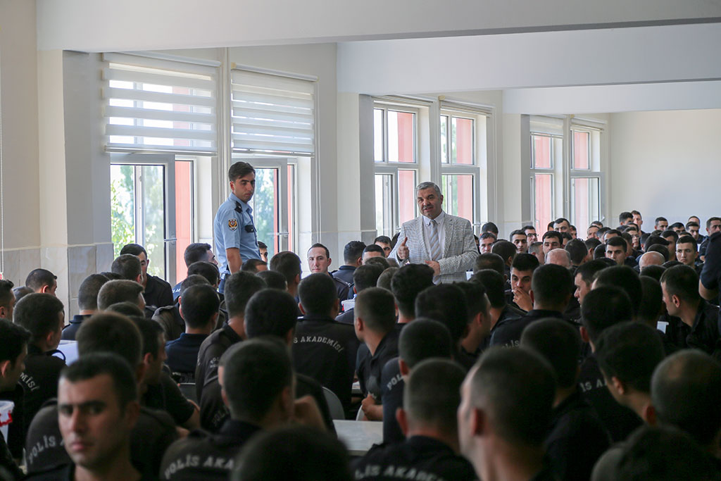Büyükşehir Belediye Başkanı Mustafa Çelik, Kayseri Polis Meslek Eğitim Merkezi’ni ziyaretinde polisliğin ne denli kutsal bir görev olduğunu belirtti. Polis adayları ile öğle yemeğinde bir araya gelen Başkan Mustafa Çelik, devletin gücünü, polisliğin önemini vurguladı. Büyükşehir Belediye Başkanı Mustafa Çelik, Kayseri Polis Meslek Eğitim Merkezi Müdürü Metin Tanrıver tarafından karşılandı. Öğle yemeğinde polis adayları ile bir araya gelen Başkan Mustafa Çelik, öğrencilere kısa süre hitap etti ve önemli konulara dikkat çekti. Polisliğin çok kutsal bir görev olduğunu vurgulayan Başkan Çelik, “Eminim ki çok kutsal bir görev yaptığınızın farkındasınız. Bizler canımızı malımızı, ezanımızı, bayrağımızı, namusumuzu sizlere emanet ettik” diye konuştu. “DEVLETE KİMSE KAFA TUTAMAZ” Polislerin bu bilinçle görev yapması gerektiğini ifade eden Başkan Çelik, ülkemizin ne denli büyük bir devlet olduğunu vurguladı. Başkan Çelik, şöyle devam etti: “Bu devlet büyük bir devlet. Kimse bu devlete kafa tutamaz. Herkes eninde sonunda yaptığı işin cezasını görecektir. 40 yıllık hesap yapanları da bu devlet bitirdi. Gönül coğrafyamızda ayakta kalan tek devletiz. Bundan sonra da farklı isimler altında tehditler gelebilir. Onlara da gerekeni yapacaksınız.” Büyükşehir Belediye Başkanı Çelik, polis adaylarına göreve başladıklarında her zaman halkla iç içe olmaları tavsiyesinde de bulundu. Başkan Mustafa Çelik, yemekten sonra Polis Meslek Eğitim Merkezi’ni gezdi. Büyükşehir Belediye Başkanı Çelik, Meslek Eğitim Merkezi’nde eğitim gören polis adaylarını da selamladı.