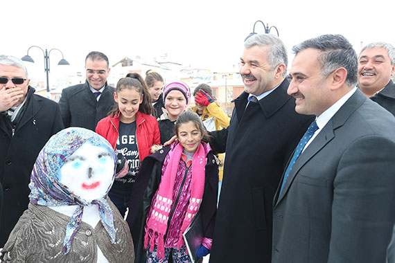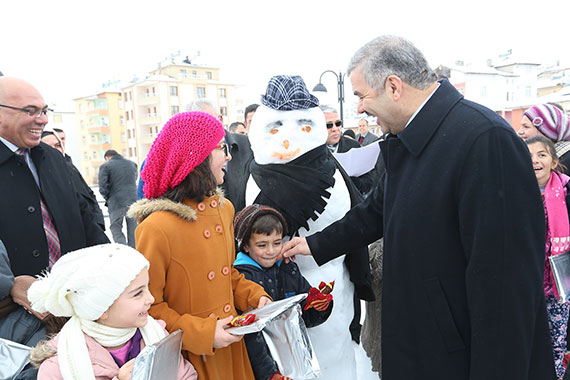 Çocuklara hediyeler de veren Başkan Çelik, bu sırada çocukların yapmış olduğu kardan adam ve kardan kadını gördü. Çocukların kıyafet de giydirmiş oldukları kardan adam ve kardan kadını çok beğenen Başkan Çelik, tüm çocuklarla fotoğraf çektirdi ve onlara çeşitli sorular sordu.