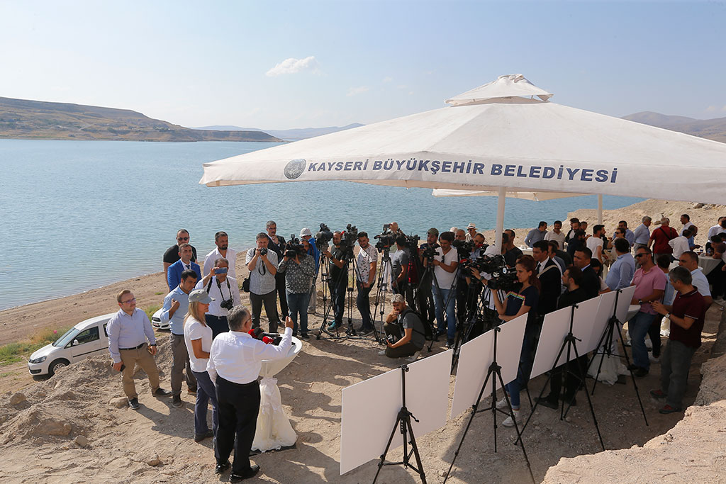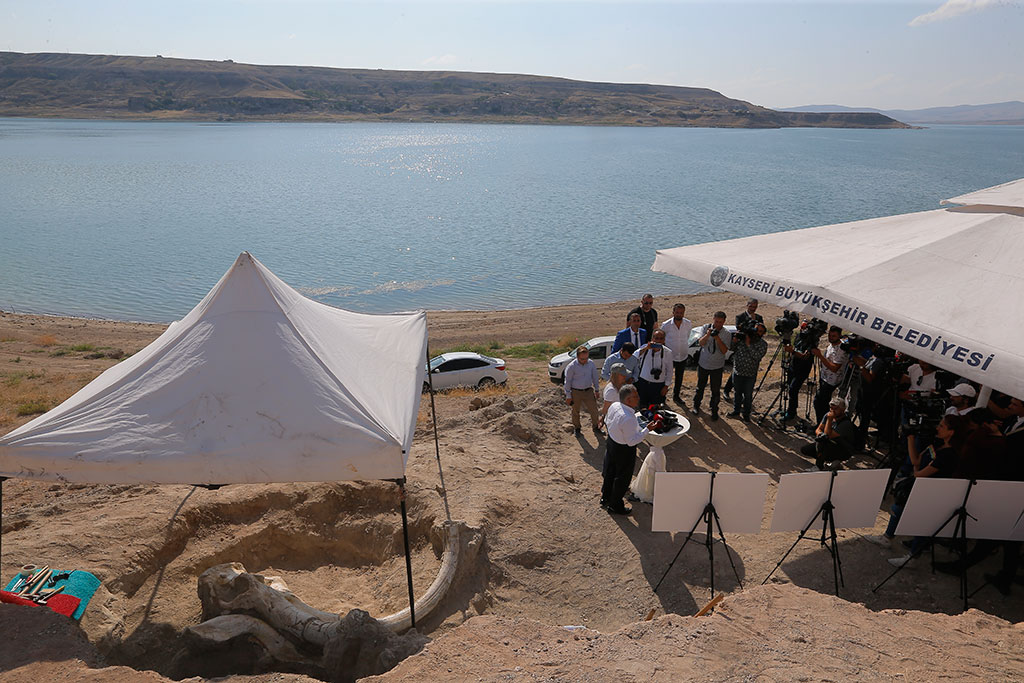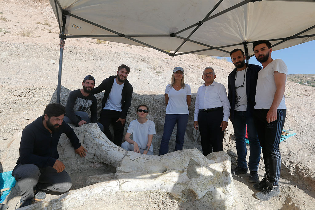 Kayseri Büyükşehir Belediyesi’nin destekleriyle Taşhan bölgesinde yapılan kazılar dünya paleontoloji bilim camiasının dikkatini Kayseri’ye çevirmesini sağladı. 7,5 milyon yıllık fosillerin bulunduğu Taşhan bölgesinde bu kez dünya literatürüne geçecek bir buluntu daha ortaya çıktı. Kayseri Büyükşehir Belediye Başkanı Dr. Memduh Büyükkılıç, kafatasının ve alt çenenin tam olarak bulunduğu dünyadaki ilk fosili kazı alanında kamuoyuna açıkladı. Kayseri Büyükşehir Belediye Başkanı Dr. Memduh Büyükkılıç, basın mensuplarıyla birlikte dünya doğa tarihine ışık tutacak çalışmaların yapıldığı Taşhan’daki kazı alanını ziyaret etti. 7,5 milyon yıllık fil, zürafa, at ve gergedanlara ait fosiller yer aldığı kazı alanında dünya literatürüne girecek bir fosil bulundu. Başkan Büyükkılıç, kazı çalışmalarının danışmanlığını yapan Ankara Hacı Bayram Veli Üniversitesi Arkeoloji Bölümü Öğretim Üyesi Prof. Dr. Okşan Başoğlu İle birlikte önemli açıklamalar yaptı. Prof. Dr. Okşan Başoğlu, Büyükşehir Belediyesi’nin desteğiyle Taşhan’da çok geniş bir fosil alanında çalıştıklarını ve çok önemli buluntulara ulaştıklarını belirtti. Kazılarda, günümüz fillerinin atası olarak bilinen choerolophodon cinsine ait çok iyi korunmuş kafatası ve alt çenenin bulunduğunu ifade eden Başoğlu, buluntunun dünya literatürüne gireceğini söyledi. “TARİHE IŞIK TUTUYORUZ” Kültepe, Keykubadiye Sarayı ve Taşhan olmak üzere Kayseri’de üç farklı alanda kazı çalışmalarına destek verdiklerini dile getiren Büyükşehir Belediye Başkanı Dr. Memduh Büyükkılıç da doğa tarihine ışık tutacak kazılarda kafa bütünlüğü ve dişleriyle 3,5 metrelik bir fosilin bulunduğunu açıkladı. Bu kazıların Kayseri’nin coğrafi yapısı ve jeolojisinin yeniden gözden geçirilmesi gerektiğini de ortaya koyduğunu dile getiren Başkan Büyükkılıç, “Buna ışık tutacak çalışmalar ortaya çıkıyor. Bu kazıları sürdüreceğiz ve tarihe ışık tutacağız. Hocalarımıza adeta iğneyle kuyu kazarcasına fedakarca yaptıkları çalışmalardan dolayı teşekkür ediyorum. Dünyadaki önemli bilim adamları şimdiden randevu alarak bu bölgeyi görmek istiyorlar” dedi. Başkan Memduh Büyükkılıç, konuşmasında Doğa Tarihi Müzesi yapmak istediklerini de ifade ederek, “Belediyemizin 150. Yılında 150 projemizi kamuoyuna açıklamıştık. Bu projeler arasında müzeler de bulunuyor. Bunlardan birisi de doğa tarihi müzesi. Bu müzeyi zenginleştirecek eserler de bu kazılarla çıkıyor diye konuştu. DÜNYANIN GÖZÜ KAYSERİ’DE Taşhan’daki kazılara doğa tarihçileri de büyük ilgi gösteriyor. Prof. Dr. Okşan Başoğlu, bilim adamlarının çok büyük bir ilgi gösterdiğini ifade ederek, önümüzdeki haftalarda dünyanın fil üzerine uzmanlaşmış en önemli isimlerinin Kayseri’ye geleceğini söyledi. Prof. Dr. Başoğlu, bu ilginin normal olduğunu belirtti ve “Çünkü muhteşem örnekler çıkıyor” dedi.