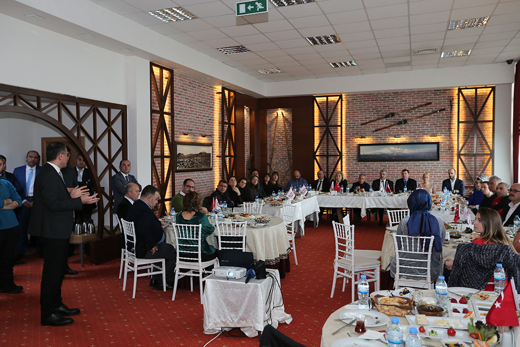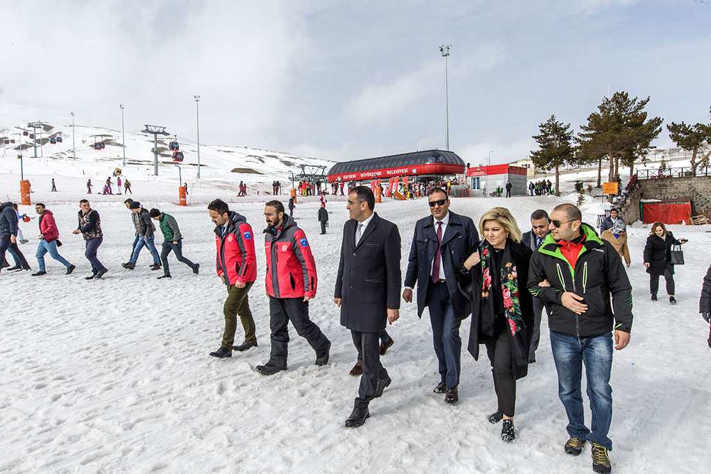 Büyükşehir Belediyesi ile Sabah Gazetesi tarafından düzenlenen İl Buluşmaları programı çerçevesinde şehrimize gelen Sabah Gazetesi Yazarları programın son gününde Erciyes’teydi. Gazetecilere Erciyes’le ilgili detaylı bilgiler verildi. Sabah Gazetesi yazarları için Erciyes A.Ş. hizmet binasında düzenlenen sunuma Büyükşehir Belediye Başkanı Mustafa Çelik de katıldı. Erciyes’le ilgili tanıtım filminin sunulmasının ardından, Sabah ve Daily Sabah ailesine Erciyes’i anlatan Büyükşehir Belediyesi Genel Sekreter Yardımcısı Hamdi Elcüman, Erciyes’in tarih boyunca önemli bir simge ve sembol olduğunu söyledi. Erciyes’in Türkiye’nin tek master planlı turizm merkezi olduğunu ifade eden Elcüman, “Erciyes’in 26 milyon metrekaresi her noktasına kadar planlandı. 23 bin 750 metre mekanik tesisimiz var ve saatte 27 bin taşıma kapasitesine sahip. 102 km kayak pistimiz var ve bunların her biri birbirine bağlantılı. Kayak pistleri birbiriyle bağlantılı dağlar dünyada son derece az. Gerçek kayak yapanlar için bu özellik çok önemli. Sezon boyunca kar garantisi sunmak için 154 adet suni kar makinesi aldık. 170 hektar alanı suni karla karlayabiliyoruz. Bu yıl 1 Aralık’ta sezonu açtık. Türkiye’de sezonu ilk açan biz olduk” dedi. “ÜÇLÜ BİR TURİZM PAKETİMİZ VAR” Sunumu Sabah Gazetesi yazarlarıyla birlikte takip eden Büyükşehir Belediye Başkanı Mustafa Çelik de kayak sporu için gelenlerin farklı aktiviteler istediklerini belirtti ve bundan hareketle üçlü bir paket hazırladıklarını söyledi. Başkan Çelik, Kayseri’nin 6 bin yıllık bir tarihi olduğunu ve bunun izlerini taşıyan şehirle birlikte Kapadokya ve Erciyes’i üçlü olarak turizme sunduklarını kaydetti. Büyükşehir Belediyesi Genel Sekreter Yardımcısı Hamdi Elcüman, sunumda “Neden Erciyes” sorusuna da cevap verdi. Erciyes’in Türkiye’nin en büyük kayak merkezi olduğunu ifade eden Elcüman, “Alplerle karşılaştırdığımızda onlardan da öndeyiz. Çünkü bizim tesislerimiz daha yeni ve bu nedenle onları geçmiş durumdayız. Onların tesisleri bizim tesislerimiz kadar konforlu değil” dedi. Elcüman, Erciyes’in ulaşım kolaylığı, şehirdeki konaklama imkanları, sosyal tesisler gibi konularda da bilgi verdi. Sabah Gazetesi yazarları sunumun ardından Erciyes’i gezerek çok daha iyi tanıma fırsatı buldular.