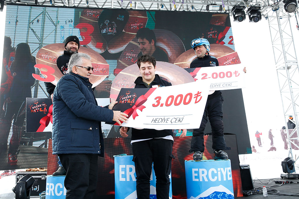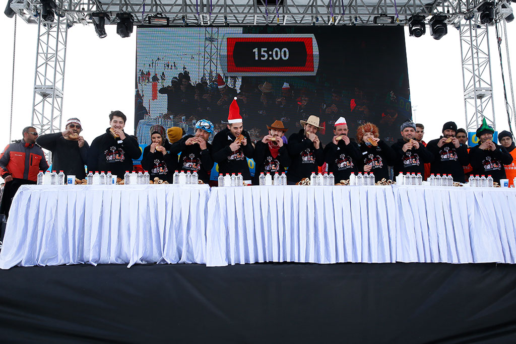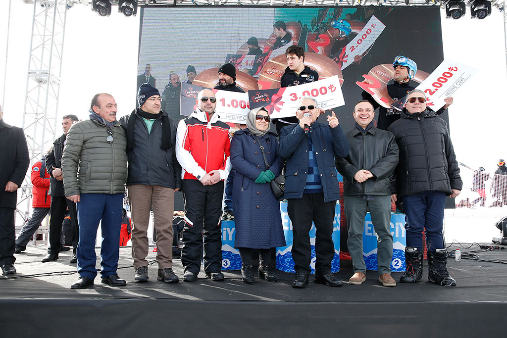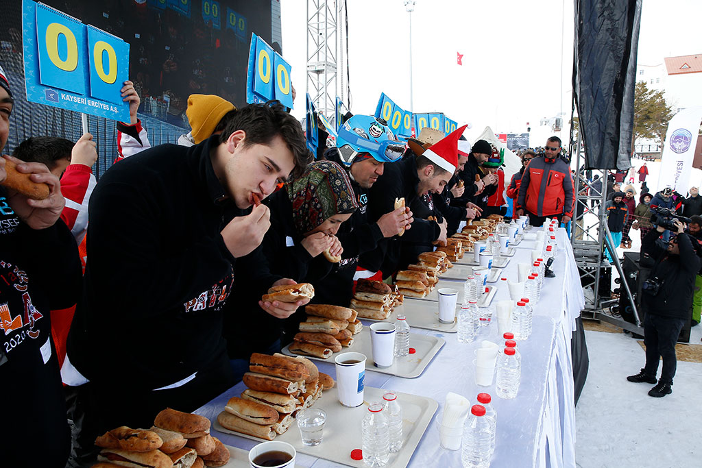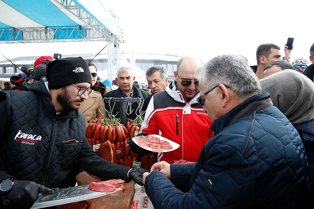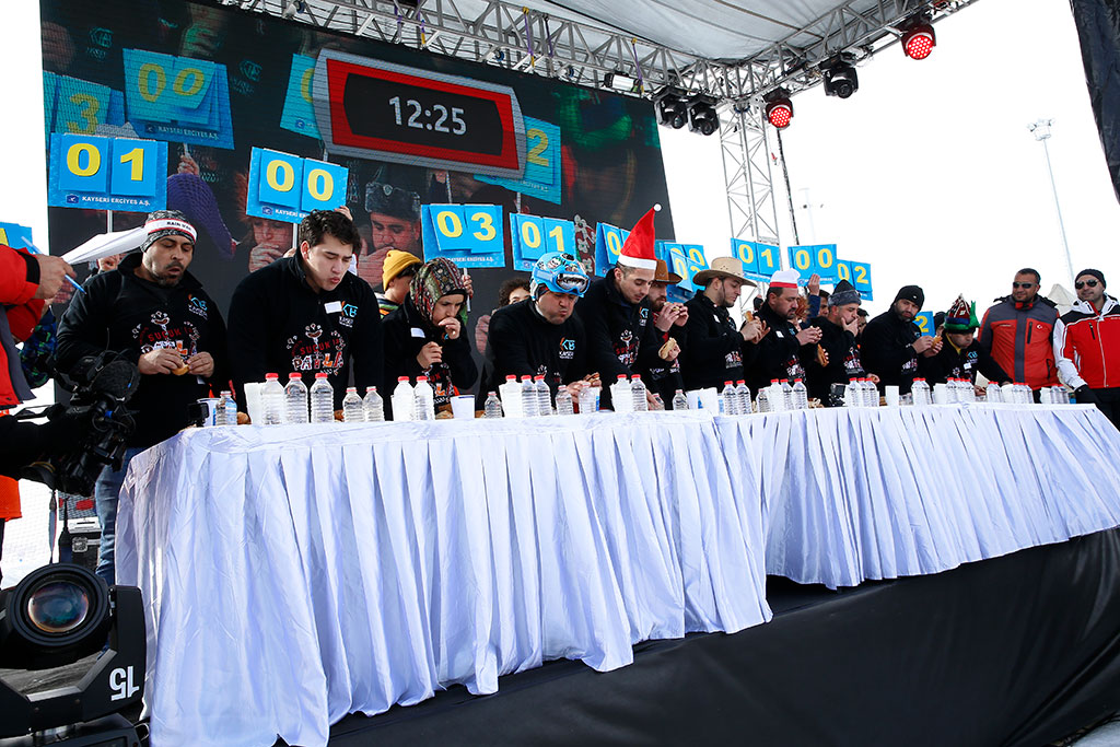 Dünya standartlarındaki pistleri ve tesisleriyle yurt içi ve yurt dışından büyük ilgi gören Erciyes, her hafta farklı etkinliklere ev sahipliği yapıyor. Kayseri Büyükşehir Belediyesi bünyesindeki Erciyes A.Ş. tarafından Kayseri Ticaret Borsası’nın sponsorluğu ile “Sucukla Patla” adı altında sucuk yeme yarışması düzenlendi. Dereceye girenlere ödüllerini veren Büyükşehir Belediye Başkanı Dr. Memduh Büyükkılıç, Kayseri’nin güzelliklerin merkezi olduğunu söyledi. Kayseri’nin en önemli turizm değeri olan Erciyes, özellikle hafta sonları büyük ilgi görmeye devam ediyor. Bu hafta sonu da yerli ve yapancı ziyaretçileriyle büyük bir yoğunluk yaşayan Erciyes, ziyaretçilerine farklı etkinliklere katılma imkanı da sundu. Bu etkinliklerden birisi olan “Sucukla Patla” yarışması ilginç görüntülerin yaşanmasına neden oldu. Yarışmayı Büyükşehir Belediye Başkanı Dr. Memduh Büyükkılıç da eşi Dr. Necmiye Büyükkılıç ile birlikte takip etti. Erciyes A.Ş. tarafından Ticaret Borsası’nın sponsorluğunda düzenlenen yarışmada, arasında sucuk bulunan 9 çeyrek ekmekle Selçuk Derin birinci, Murat Anlı ikinci, İbrahim Budak da üçüncü oldu. Yarışmada dereceye girenlere ödüllerini Büyükşehir Belediye Başkanı Dr. Memduh Büyükkılıç verdi. Yarışmanın birincisi 3 bin TL, ikincisi 2 bin TL, üçüncüsü ise 1000 TL ile ödüllendirildi. “GÜZELLİKLERİN MERKEZİ KAYSERİ” Yarışmaya katılanları ve derece alanları tebrik eden Büyükşehir Belediye Başkanı Dr. Memduh Büyükkılıç, “Bu güzel etkinliğe desteğini esirgemeyen Ticaret Borsası Başkanı Recep Bağlamış ve Borsa yönetimine teşekkür ediyorum. Kayseri denince akla sucuk, pastırma, mantı gelir. Kayseri denince akla gastronominin, kayağın, kültür turizminin ve sağlık turizminin merkezi gelir. Erciyes’in karı Kayseri’nin kârı oluyor. Böyle bir projeyi şehrimize kazandıran Mehmet Özhaseki Bakanımıza hem geçmiş olsun diyor hem de teşekkür ediyoruz. Bu güzel etkinlikler devam edecek. Erciyes’imiz ve Kayseri’miz hep güzelliklerle anılacak” dedi. Yarışmayı takip eden Erciyes Üniversitesi Rektörü Prof. Dr. Mustafa Çalış da Erciyes’te yapılan güzel etkinliklerden dolayı Başkan Memduh Büyükkılıç’a teşekkür etti. Yarışma sonrası izleyicilere de pastırma ve sucuk ikram edildi.