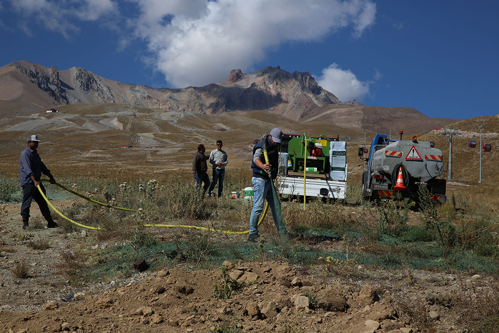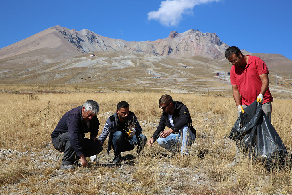 Erciyes’te yeşil doku oluşturulması için çalışmalar yapan Büyükşehir Belediyesi, doğal olarak yetişen bitki türleri üzerinde çalışmalar yaptı ve bu bitkilerin zenginleştirilmesi için gönüllü vatandaşlarla tohum toplama etkinliği düzenledi. Toplanan tohumların bahar aylarında ekimi yapılacak. Erciyes Kış Turizm Merkezi’ndeki yoğun kullanımın olduğu bölgelerde bitki dokusunun seyrelmesinin kar tutma süresinin azalmasına sebep olduğu tespit edildi. Büyükşehir Belediyesi tarafından yapılan çalışmalar sonucu kar tutma süresinin uzatılabilmesi ve yağışın etkisiyle oluşabilecek erozyonun önlenmesi için Erciyes’te yeşil doku oluşturulması projesi başlatıldı. Bu proje kapsamında, Erciyes’teki bitki dokusunun zenginleştirilmesi için mevcut bitki örtüsü incelendi ve Mayıs ayında toprak analizleri yapıldı. Bu analizler sonucu doğal olarak yetişen sığır kuyruğu, kangal türleri, sirken, papatya, korunga, keven, yakı otu (Orman gülü) gibi türler üzerinde çalışılmasının uygun olduğuna karar verildi. Yine Büyükşehir Belediyesi Park Bahçe ve Ağaçlandırma Daire Başkanlığı’nın yaptığı çalışmalar sonucu Tekir Bölgesinde bulunmayan; ama Hacılar ve Hisarcık bölgelerinde 1800 rakıma kadar görülebilen gül hatmi çiçeğinin de bu çalışmada kullanılarak doğal çeşitlendirme yapılması öngörüldü. Bu nedenle Hacılar ve Hisarcık’ta özellikle mezarlıklarda yaygın halde bulunan gül hatmi tohumları, Tekir ve Hacılar kapılardan ise papatya tohumları Temmuz-Ağustos aylarında toplanarak Büyükşehir Belediyesi fidanlığında ekime hazır hale getirildi. Ekime hazır hale getirilen papatya, gül hatmi, orman gülü (yakı otu) tohumlarına önceki yıl toplanan sığır kuyruğu tohumları da eklenerek, Tekir kapı ve Hacılar kapıda toplam 60 bin m2’lik alanda ekim yapıldı. Bu alanda ayrıca kar tutma süresinin uzatılabilmesi ve erozyonu önlemek için hydroseeding püskürtme ekim yöntemi ile çim ekimi de gerçekleştirildi. Bu arada Büyükşehir Belediyesi tarafından 38 gönüllü vatandaş ile bahar döneminde ekilmek üzere tohum toplama etkinliği de gerçekleştirildi. Etkinlikte, sığır kuyruğu, papatya ve kangal türlerinin tohumları toplandı.