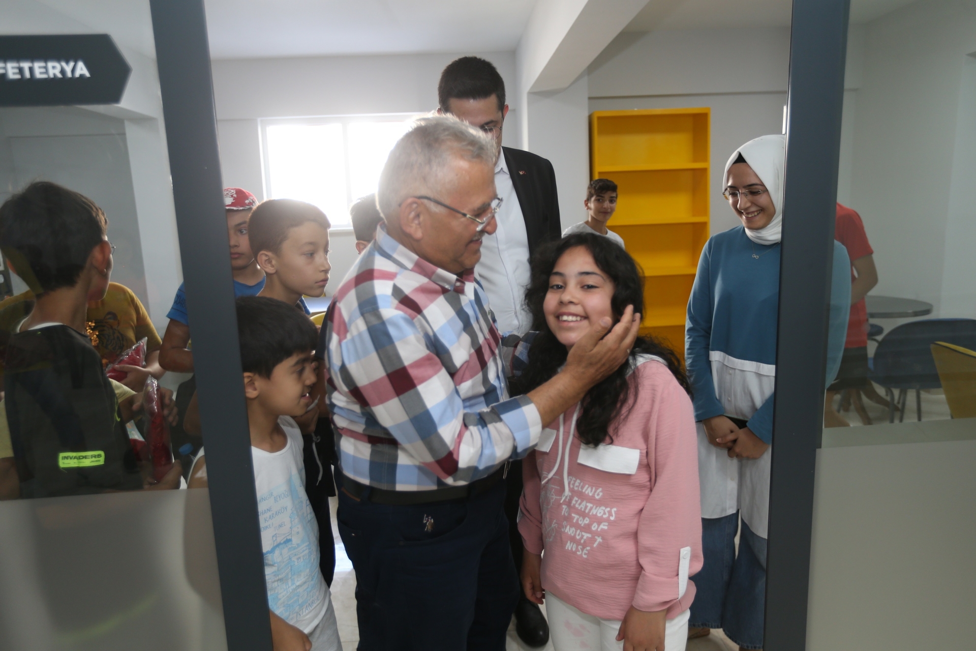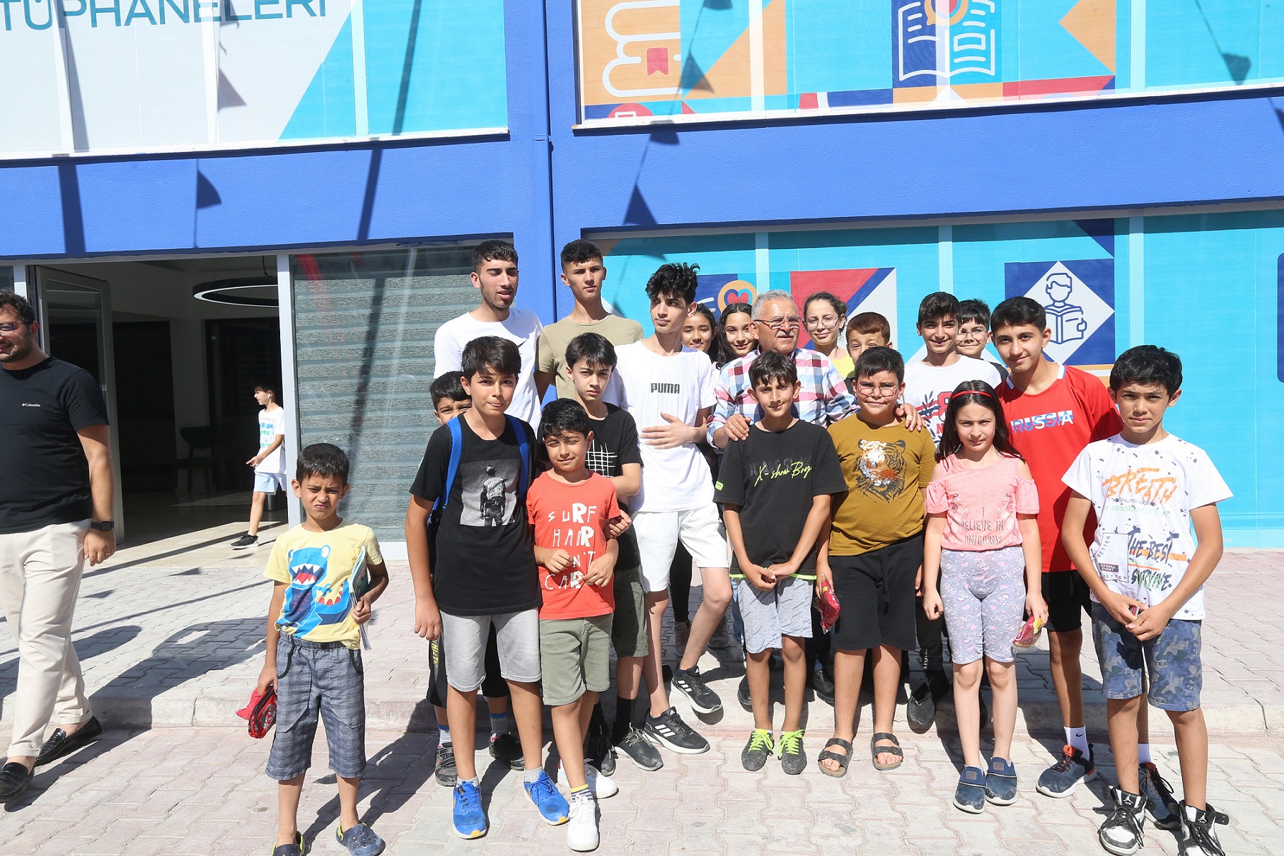 Belediye Başkanı Dr. Memduh Büyükkılıç, hizmete açılan kütüphaneyi gezerek, öğrencilerle