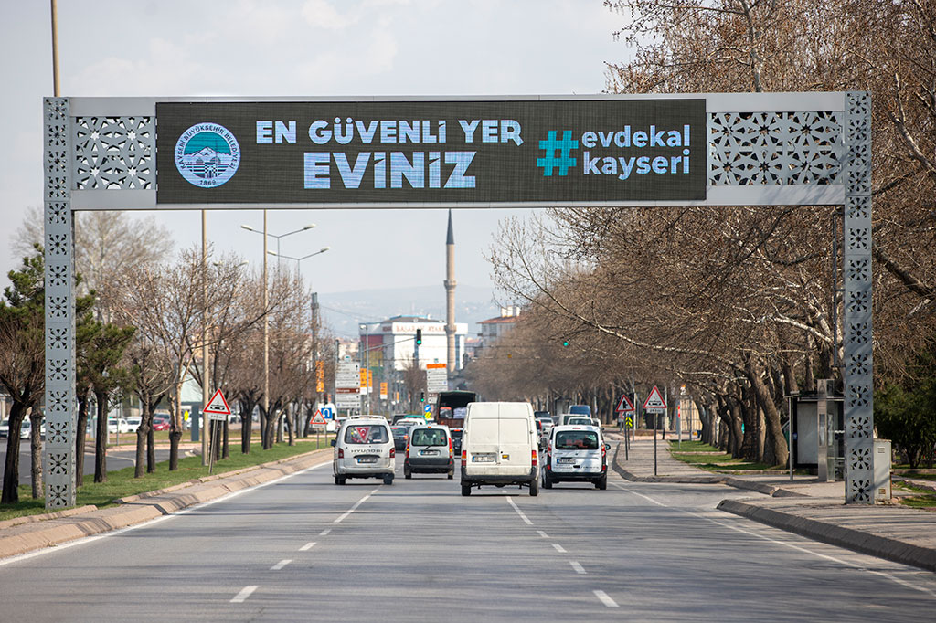 Kayseri Büyükşehir Belediye Başkanı Dr. Memduh Büyükkılıç’ın, dünyayı etkileyen koronavirüs salgınından en az etkilenmek adına yapmış olduğu “evde kal” çağrıları trafik ışıkları ve dijital yön levhalarına da yansıdı. Kayseri Büyükşehir Belediyesi, Kayserililerin zorunlu olmadıkça evden çıkmaması için yapmış olduğu çağrıları hemen her platformu kullanarak sürdürüyor. Koronavirüs tehdidinin en aza indirgenmesi için yapılan çağrılarda trafik ışıkları ve dijital yön levhaları da kullanılıyor. Trafikteki sürücüler ve yayalar kırmızı ışıkla birlikte “Evde Kal” yazısı ile karşılaşıyor. Şehrin farklı bölgelerinde yer alan dijital baş üstü yön levhalarıyla da vatandaşlara aynı çağrı iletiliyor. Dijital yön levhalarında “En güvenli yer eviniz”, “Evde Kal Kayseri” ifadeleri yer alıyor. Büyükşehir Belediye Başkanı Dr. Memduh Büyükkılıç, kişisel ve toplum sağlığı için en önemli önlemin bu dönemde evde kalmak olduğunu ifade etti. Tüm Kayserililerden yapılan çağrılara uymalarını beklediklerini dile getiren Başkan Büyükkılıç, küresel bir tehdit olan koronavirüsün toplumun duyarlılığı ile yenilebileceğini kaydetti.