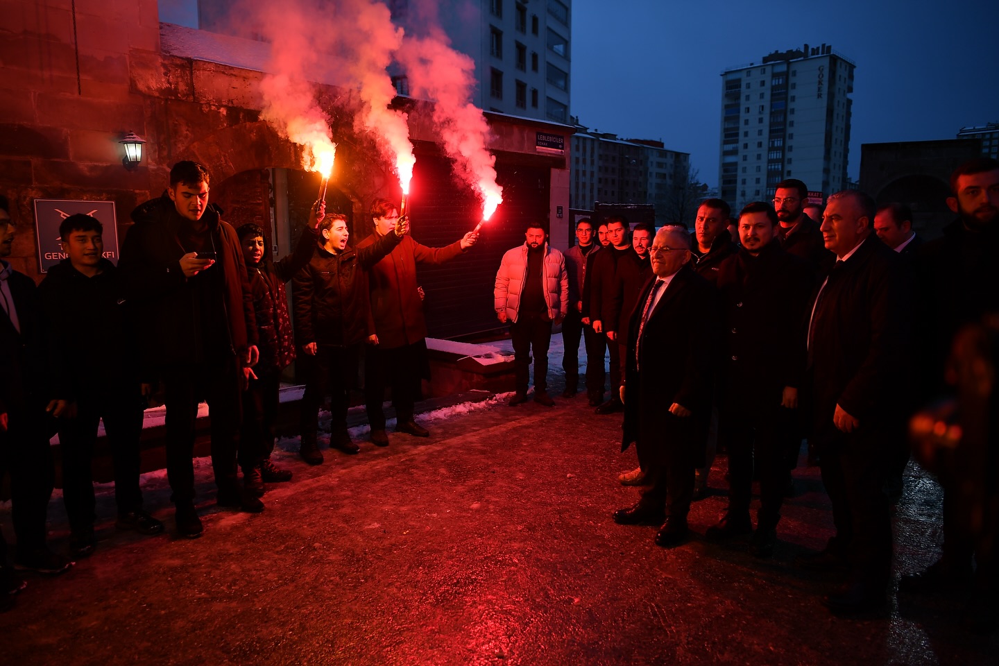 Kayseri Büyükşehir Belediye Başkanı Dr. Memduh Büyükkılıç, TÜGVA Kayseri İl Temsilciliği önünde gençler tarafından meşalelerle karşılandı.