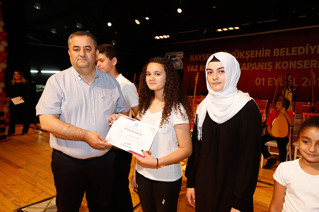 Kayseri Büyükşehir Belediyesi Konservatuvarı’nın yaz dönemi kursları sona erdi. 3 bini aşkın öğrencinin katıldığı yaz dönemi kurslarının kapanışı nedeniyle sertifika töreni düzenledi. Büyükşehir Belediyesi Konservatuvarı Yaz Kursları Kapanış Konseri ve Sertifika Töreni Kadir Has Kültür ve Sanat Merkezi’nde yapıldı. Törene Büyükşehir Belediyesi Genel Sekreteri Hüseyin Beyhan, Büyükşehir Belediyesi Meclis Başkan Vekili Emine Timuçin, kursiyerler ve aileleri katıldı. Kadir Has Kültür ve Sanat Merkezi’nin tamamen doldurulduğu törende bir konuşma yapan Büyükşehir Belediyesi Genel Sekreteri Hüseyin Beyhan, yaz döneminde açılan yedi farklı kursta 3 bin 50 öğrenciye eğitim verildiğini belirtti. Her öğrencinin sanatsal faaliyetlerde bulunması için gayret gösterdiklerini ifade eden Beyhan, bu amaçla her geçen yıl Büyükşehir Belediyesi Konservatuvarı’nın kapasitesini artırmaya devam ettiklerini kaydetti. Daha sonra yaz dönemi kurslarına katılan öğrencilere sertifikaları verildi.