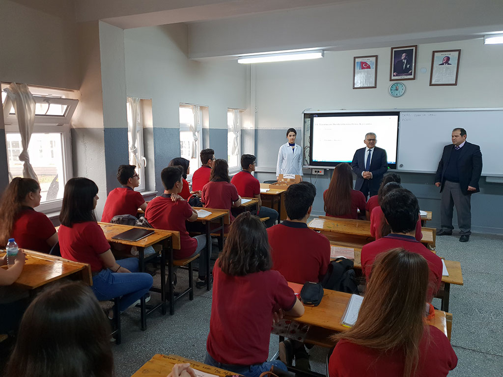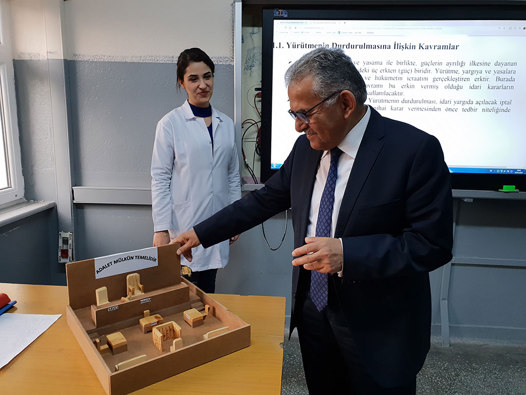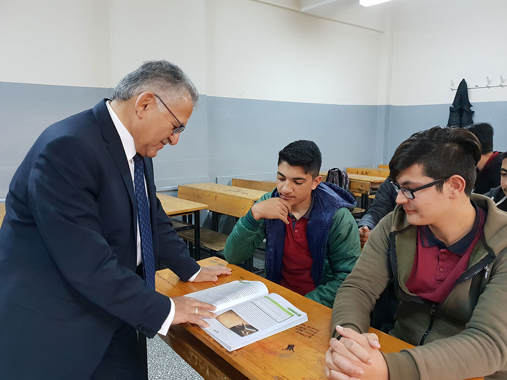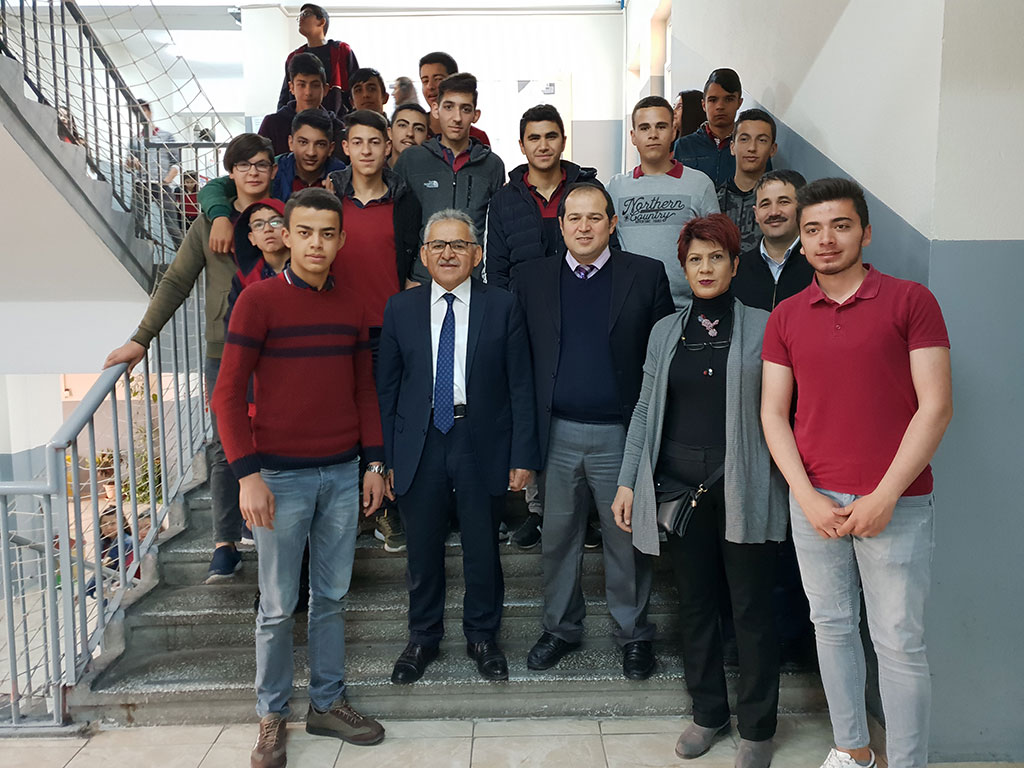 Kayseri Büyükşehir Belediye Başkanı Dr. Memduh Büyükkılılç, yoğun programlarına rağmen zaman zaman okulları ziyaret ederek geleceğimiz olan gençlerle bir araya geliyor. Başkan Büyükkılıç, bugün de Mehmet Akif Ersoy Mesleki ve Teknik Anadolu Lisesi’ne sürpriz bir ziyaret yaptı. Büyükşehir Belediye Başkanı Memduh Büyükkılıç, Mehmet Akif Ersoy Mesleki ve Teknik Anadolu Lisesi’ni ziyaret ederek Okul Müdürü Ercan Çıtak ile birlikte okulu ve sınıfları gezdi. Başkan Büyükkılıç, bazı sınıfları da ziyaret ederek öğrencilerle bir araya geldi. Tıp Fakültesi mezunu bir hekim olmasına rağmen aynı zamanda Açık Öğretim Fakültesi Kamu Yönetimi 3. Sınıf öğrencisi olduğunu hatırlatan Başkan Büyükkılıç, “Okumanın yaşının olmadığını göstermek istiyorum. Ya öğrenen, ya öğreten olmak lazım. Biz gençlerimizi çok seviyoruz. Onlara hizmet etmek bizim için bir ibadet. Kendilerine kurulan tuzaklara düşmeyecek yeni nesillerin olmasını istiyoruz” dedi. Gençlere tavsiyelerde bulunan ve hayatın bir yarış olduğunu hatırlatan Başkan Büyükkılıç, “Bulunduğunuz yerin en donanımlısı olmaya çalışın” ifadelerini kullandı. Teknoloji bağımlılığına da değinen Başkan Büyükkılıç, teknoloji bağımlılığının tehditleri ile ilgili gençleri uyardı ve “Teknolojiye biz hükmetmezsen o bize hükmediyor” şeklinde konuştu. Büyükşehir Belediye Başkanı Büyükkılıç, Mehmet Akif Ersoy Mesleki ve Teknik Anadolu Lisesi’nin öğretmenleriyle de bir araya gelerek isteklerini sordu. Eğitime verdikleri önemi vurgulayan Başkan Büyükkılıç, Melikgazi Belediye Başkanlığımız döneminde 16 okul yaptırdık. Dolayısıyla eğitim bizim için çok önemli” diye konuştu.