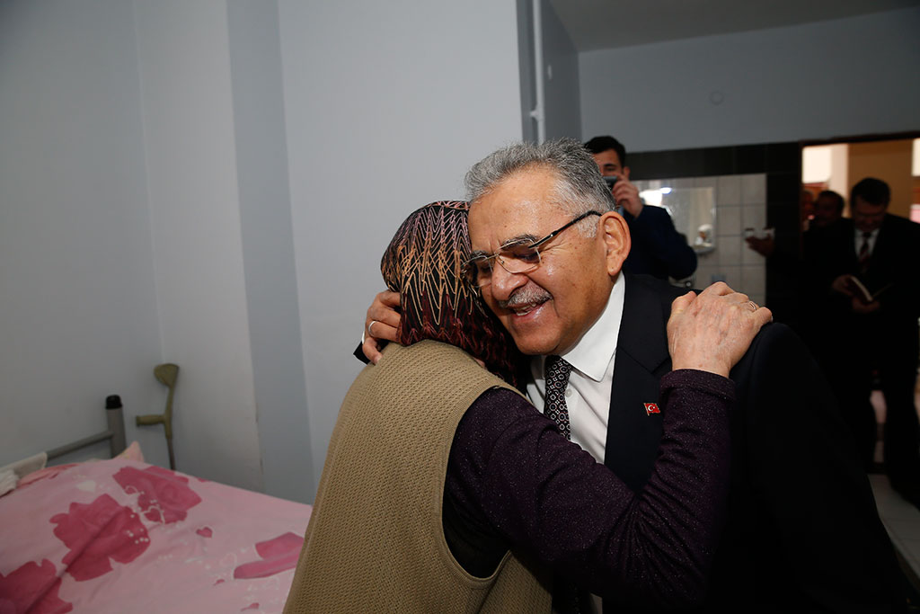 Büyükşehir Belediye Başkanı Büyükkılıç, Huzurevi’nin kadınlar bölümüne de geçerek yaşlılarımızı ziyaretini sürdürdü. Hatırını sorduğu her yaşlının duasını alan Başkan Büyükkılıç, selam vermek için geldiğini söyleyince “Allah da size selam versin” cevabı aldı. Başkan Büyükkılıç, hasta ve yorgun olan yaşlılarımızı da bizzat odalarında ziyaret ederek bir istekleri olup olmadığını sordu.